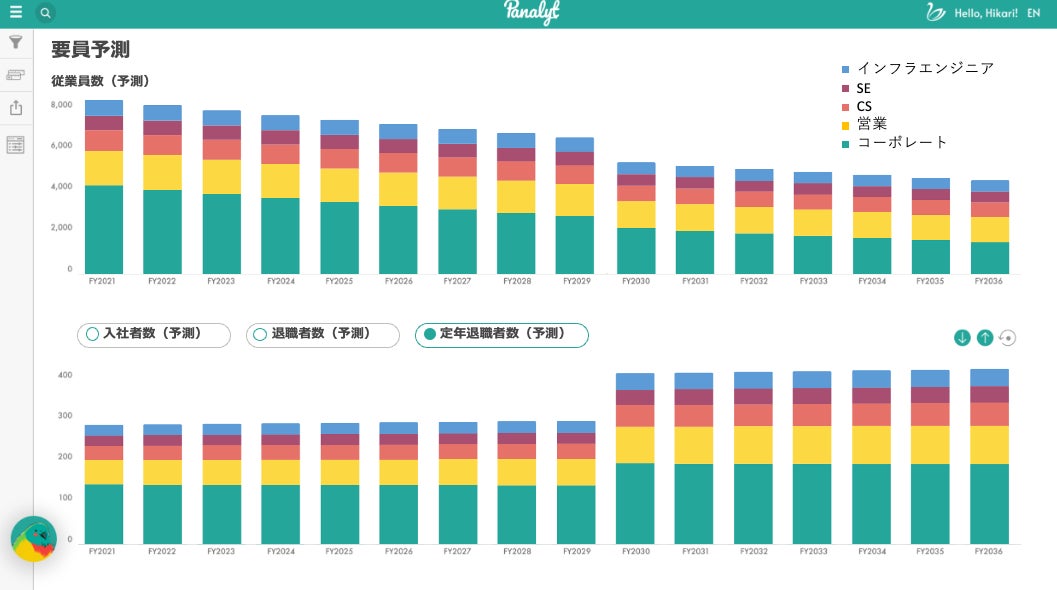 過去の人事データをもとに、15年先までの要員構成を、年代別・職種別などの様々な従業員属性別に高精度予測。統計モデルとAIを活用し、企業版「未来の人口ピラミッド」を可視化。労働市場縮小に備えた人材ポートフォリオ戦略を支援。2025年には人件費の予測機能も追加予定。