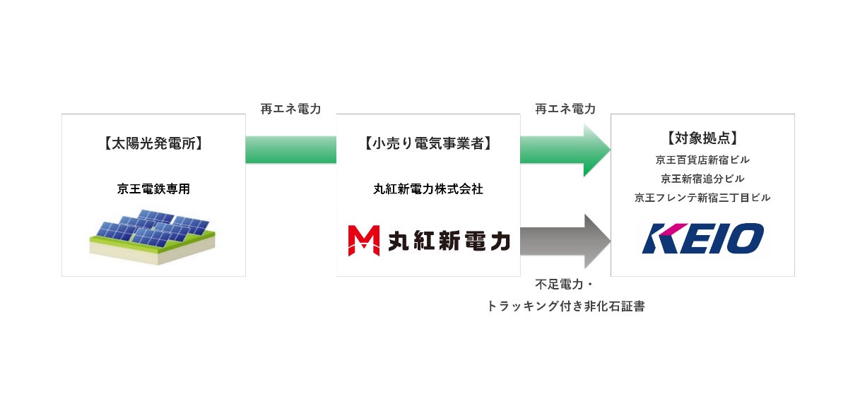 この取り組みでは、2026年4月より「京王百貨店新宿ビル」「京王新宿追分ビル」「京王フレンテ新宿3丁目ビル」(以下、「対象拠点」)に対して、丸紅新電力が太陽光発電設備による再生可能エネルギー電力の供給を開始するとともに、不足する電力にトラッキング付非化石証書※2を付与することで、対象拠点の電気の使用に際し排出していた年間約8,000t-CO₂を実質的に削減が可能となります。