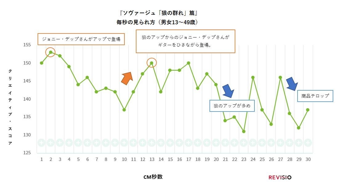 一番見られたシーンはCM冒頭で、寝そべっているジョニー・デップさんがアップで初めて映るシーンでした。その後注目が下がっていきますが、ジョニー・デップさんのギターの演奏シーンで再び注目が上がります。21秒あたりからセリフを言い始めますが注目度は上下に動き、狼単体のシーンでやや下降傾向になりました。CM後半、商品名と企業名のテロップのあたりからやや下がり、最後の「ディオール」という音声でやや上昇するという結果になりました。