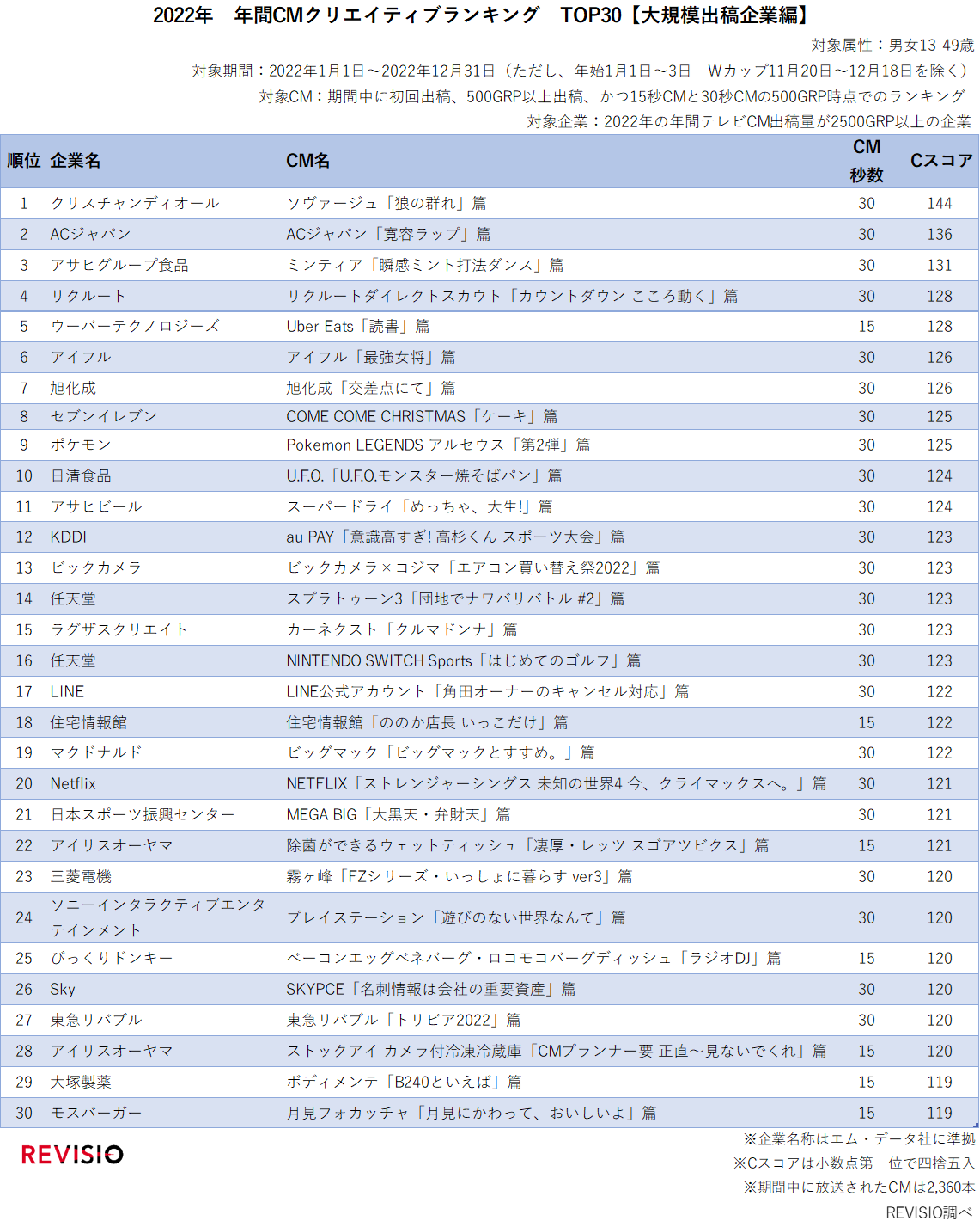 ご家庭に人体認識技術を搭載した機器を設置し、テレビの「視られている量」を測るREVISIO株式会社(所在地 :東京都千代田区、代表取締役社長 郡谷 康士、以下REVISIO)は、 テレビCMを大規模出稿している企業に絞り、2022年年間で視聴者の視線を釘付けにしたテレビCMクリエイティブのランキング「2022年 年間CMクリエイティブCスコアランキングTOP30【大規模出稿企業編】」を公開しました。