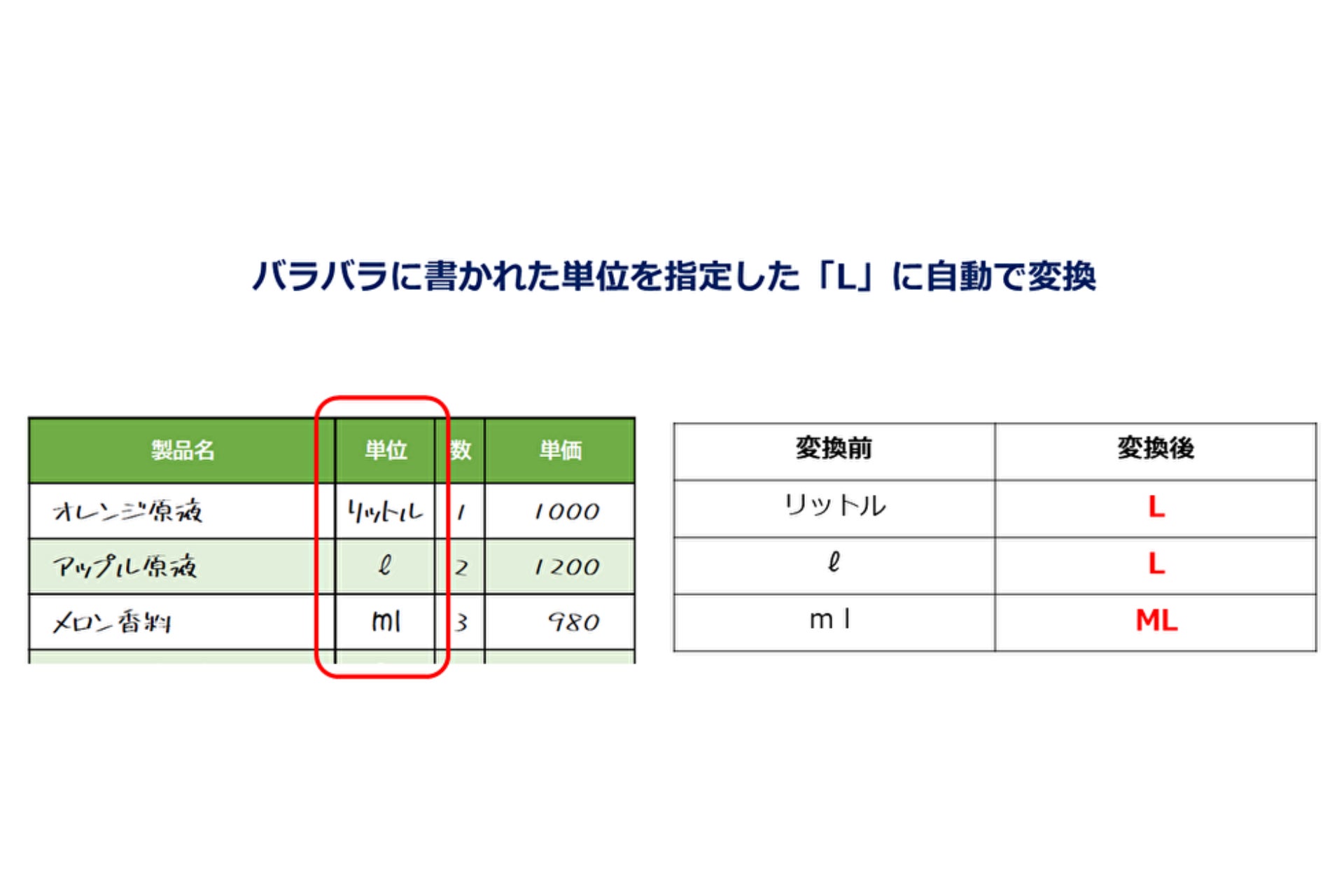 認識した結果を指定した文字に置き換えることができます。例えば、取引先ごとにバラバラの表記で送られてくる注文書の単位を統一させることができます。