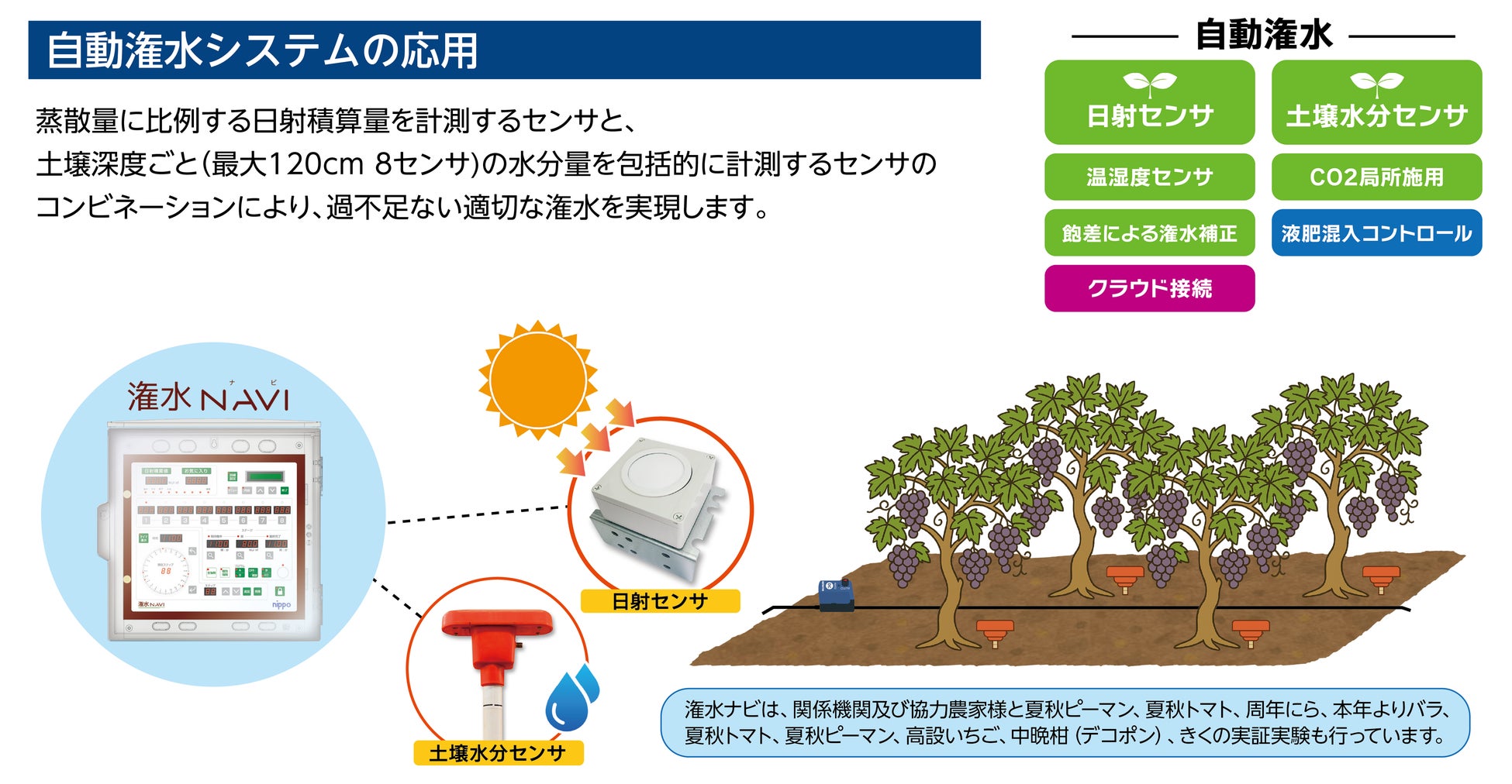 蒸散量に比例する日射積算量を計測するセンサと最大120cm、8センサの土壌深度ごとの水分量を計測するセンサのコンビネーションにより、過不足ない適切な灌水を実現します。
