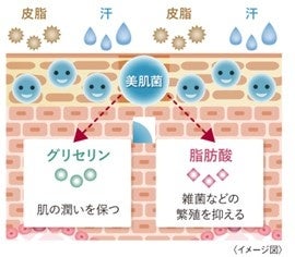 “美肌菌”は、皮脂や汗をグリセリンや脂肪酸に変換する事で、肌に潤いを与えます。