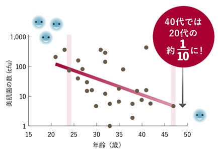 被験者20~40代の女性の顔の皮膚常在菌を採取し、美肌菌を選択的に培養して菌数を計算したところ、40代では20代の約1/10に美肌菌が減少する結果に。