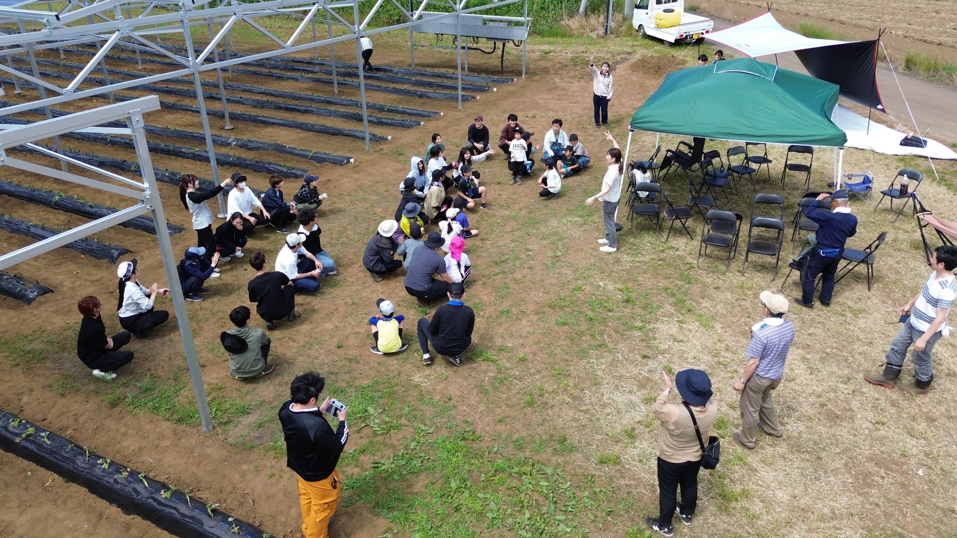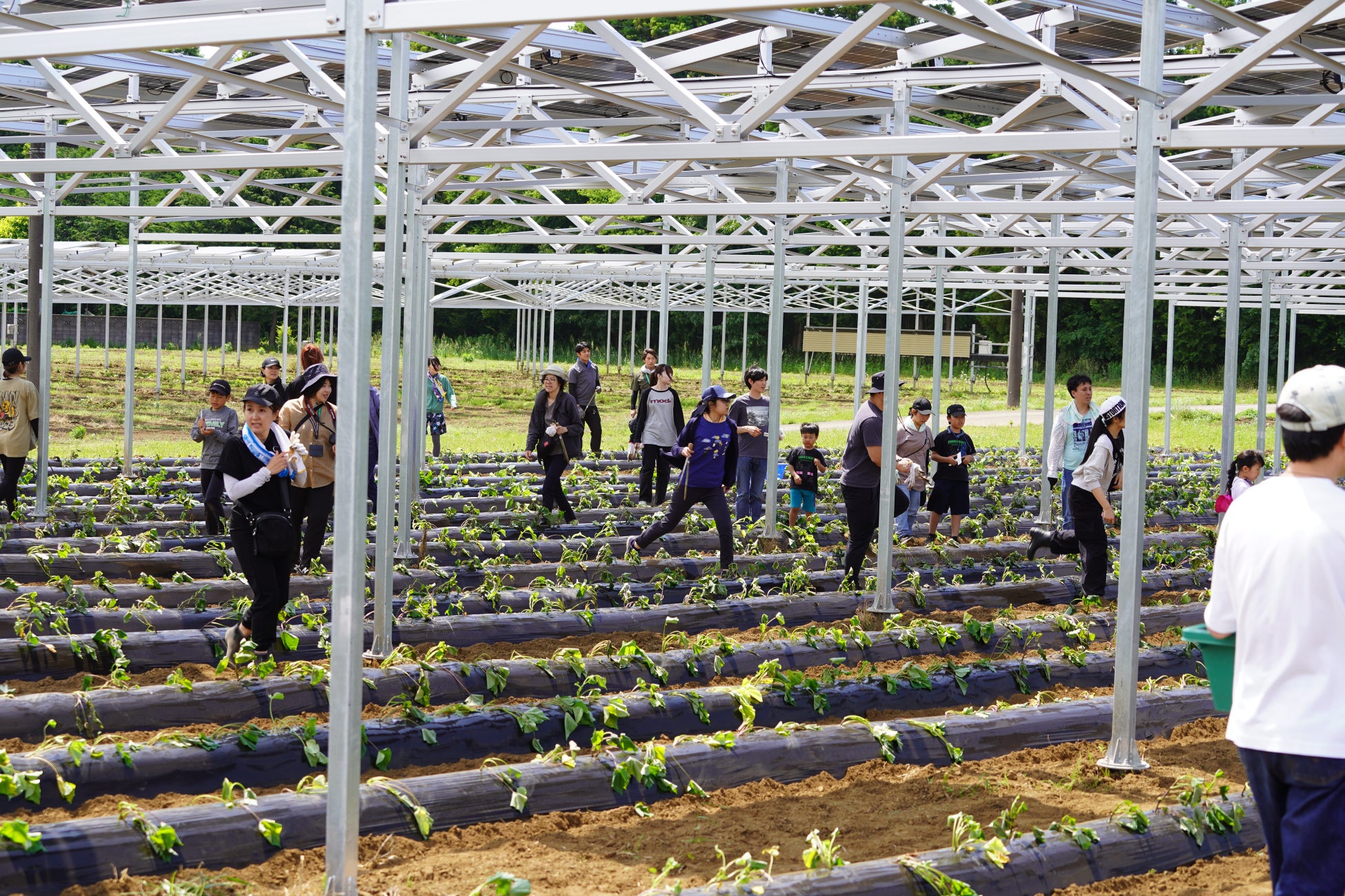 人に欠かすことのできない「食」と「エネルギー」。営農型太陽光発電は、農地の上に太陽光パネルを設置し、農業と太陽光発電を同時に行うことによって、食料と電気(エネルギー)を同時に生産することができます。2023年にはテレビ東京系「ガイアの夜明け」にて当社の営農型太陽光発電の取り組みが取り上げられたこともあり、営農型太陽光発電の取組は期待されてきています。地域の方々や子どもたち、次の世代を担う学生たちに、この「新しい農業のカタチ」を五感で感じてもらいました