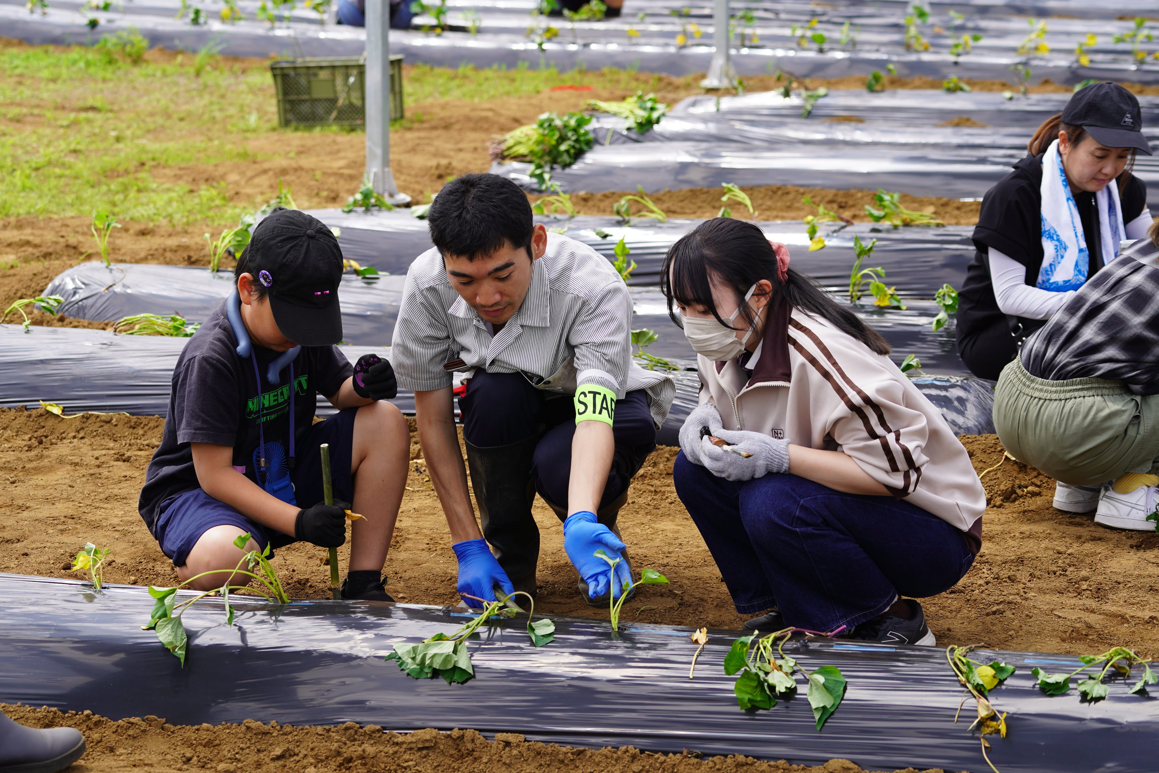 本イベントは、千葉商科大学の学生と共同で企画・運営をしました。当日は、千葉商科大学の学生および同大学のキャンパスがある市川市の家族連れなど、合わせて約50名が集い、さつまいもの植付け体験を実施しました。植え付け体験では、学生と参加者がペアとなり、植付けのレクチャーをしたり、休憩時間には、学生企画のレクリエーションを実施するなど地域の方々と学生が交流する場の創出を目指す「第一歩」になりました。