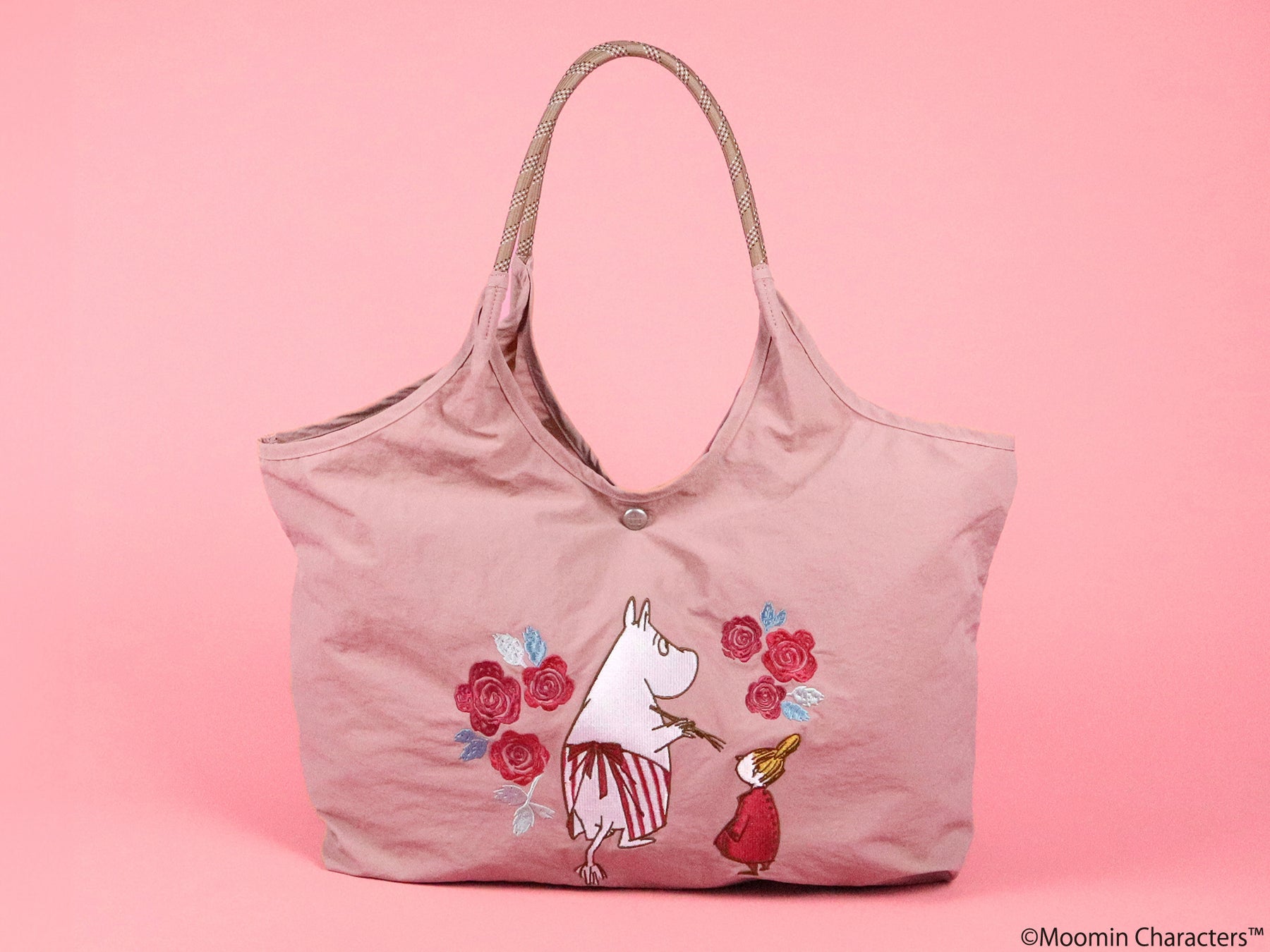 ムーミンママとリトルミイの刺繍デザインが華やかなナイロンバッグ。お出かけにぴったりのたっぷりしたサイズ感で、日常から旅行まで幅広いシーンで活躍します。軽撥水加工で簡単にお手入れできるのも嬉しいポイント。