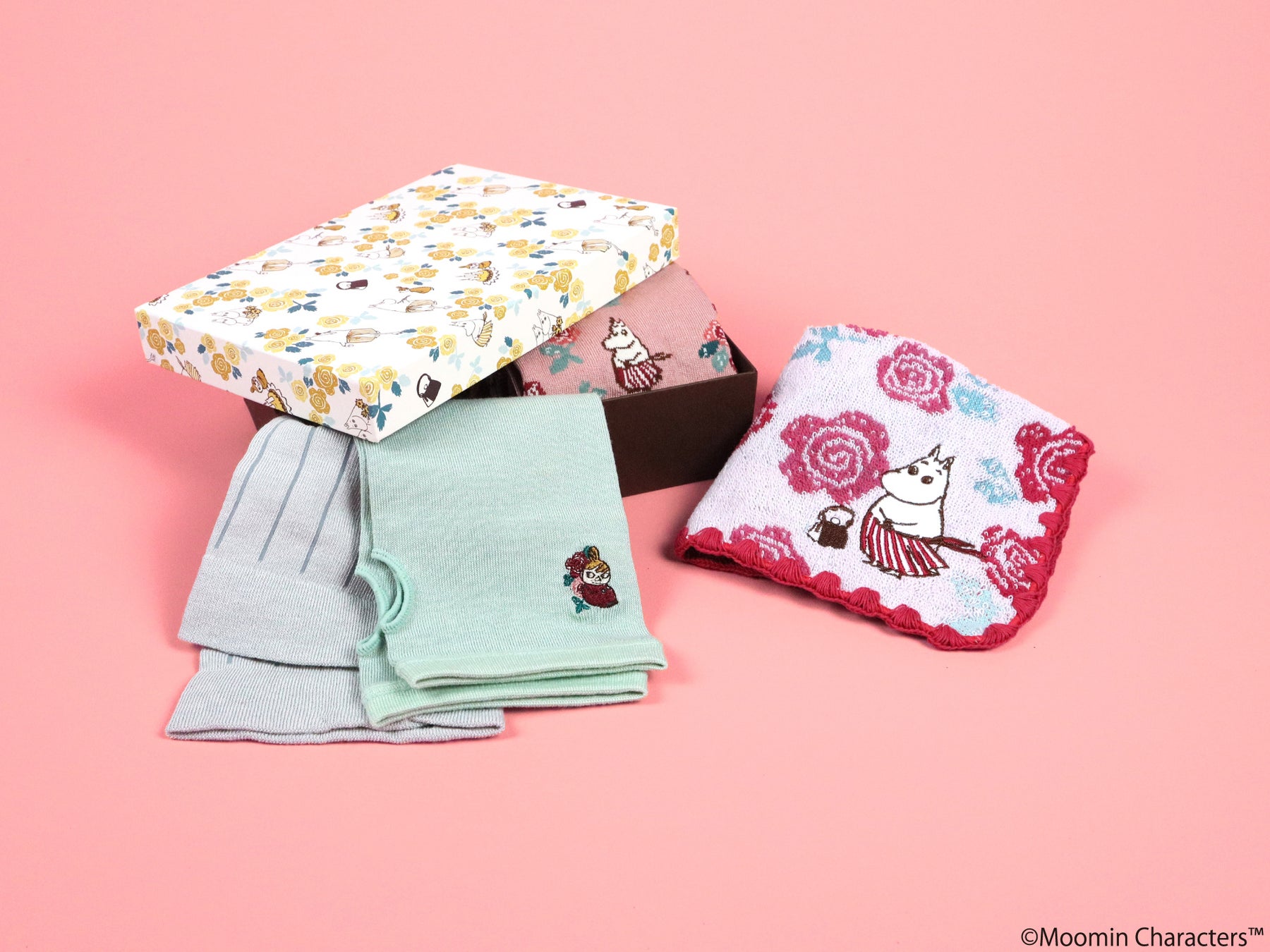 手軽に使えるミニタオル、紫外線対策には必須のアームカバー。このように選んだアイテムを自分で詰めるギフトボックスも「オールアバウトムーミンママ」柄です。