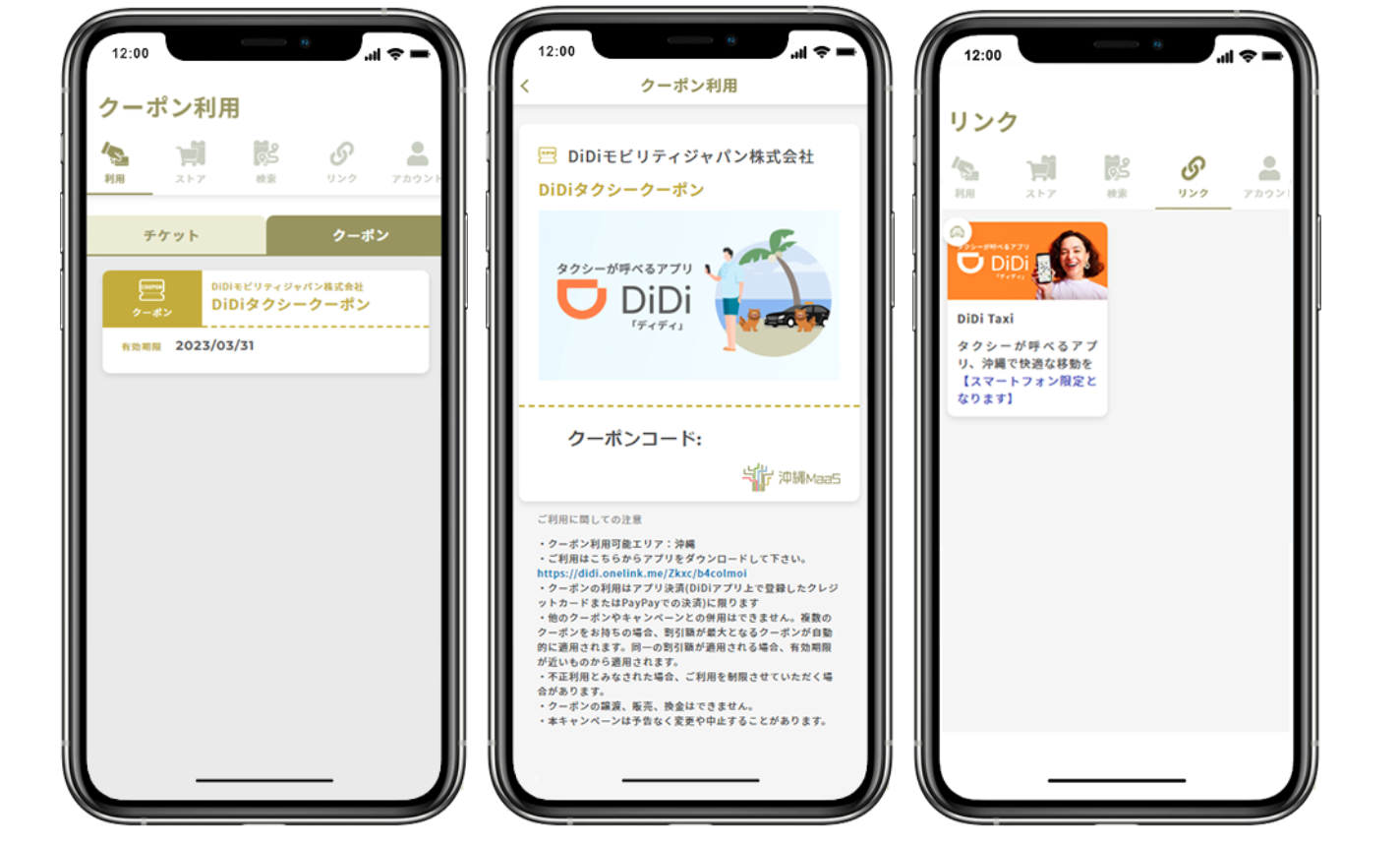 ・クーポン取得方法:「沖縄MaaS」チケット購入サイトのクーポンページ上で表示される、対象のクーポンコードを「DiDi」アプリ上で入力