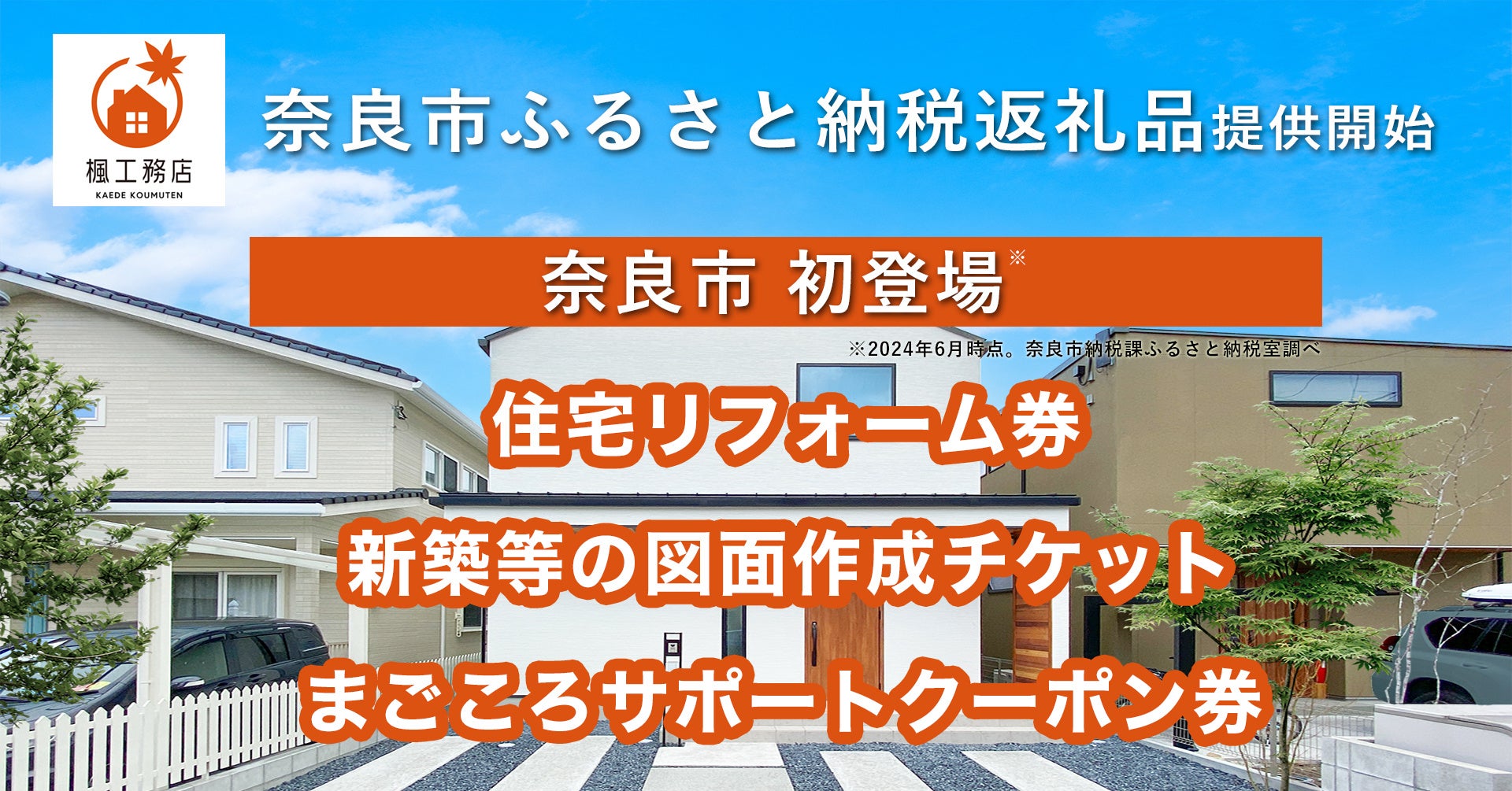 「笑顔を創造しつづける」を企業理念に掲げ、奈良・京都南部で住宅事業や介護・保育事業を展開する株式会社楓工務店(代表:田尻 忠義、以下「当社」)は、2024年6月24日より、奈良県奈良市のふるさと納税返礼品事業者として、事業に関連する返礼品の提供を開始しました。返礼品は奈良市では初めて(※1)となる「住宅リフォーム券」、「新築などの図面作成チケット」、そしてシニア向けの「まごころサポートクーポン券」となります。寄付額に応じてご利用いただけます。