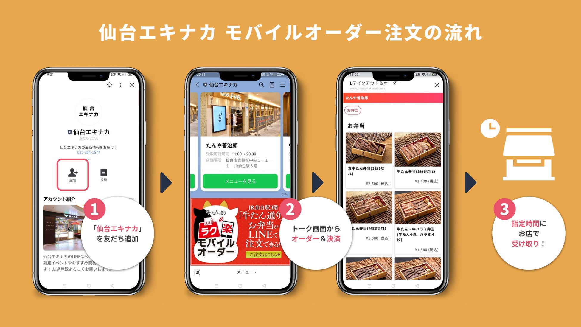 2022年5⽉16⽇(⽉)より、この「⽜たん通り」6店舗で、⽜たん弁当などを待たずに受け取れるLINE事前予約決済サービス、モバイルオーダーとして「Lテイクアウト&オーダー」が導⼊されることとなりました。仙台駅構内店舗の情報を発信している「仙台エキナカ」公式LINEアカウントを友だち追加することで簡単にご利⽤いただけます。