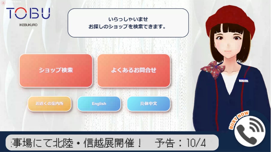 今回、多言語対応が始まるのは、東武百貨店 池袋本店に設置されている、アバターによるお客様ご案内サービス。英語と中国語(簡体字)へ対応し、必要に応じてフロアマップなどの表記を日本語から変更できます。
