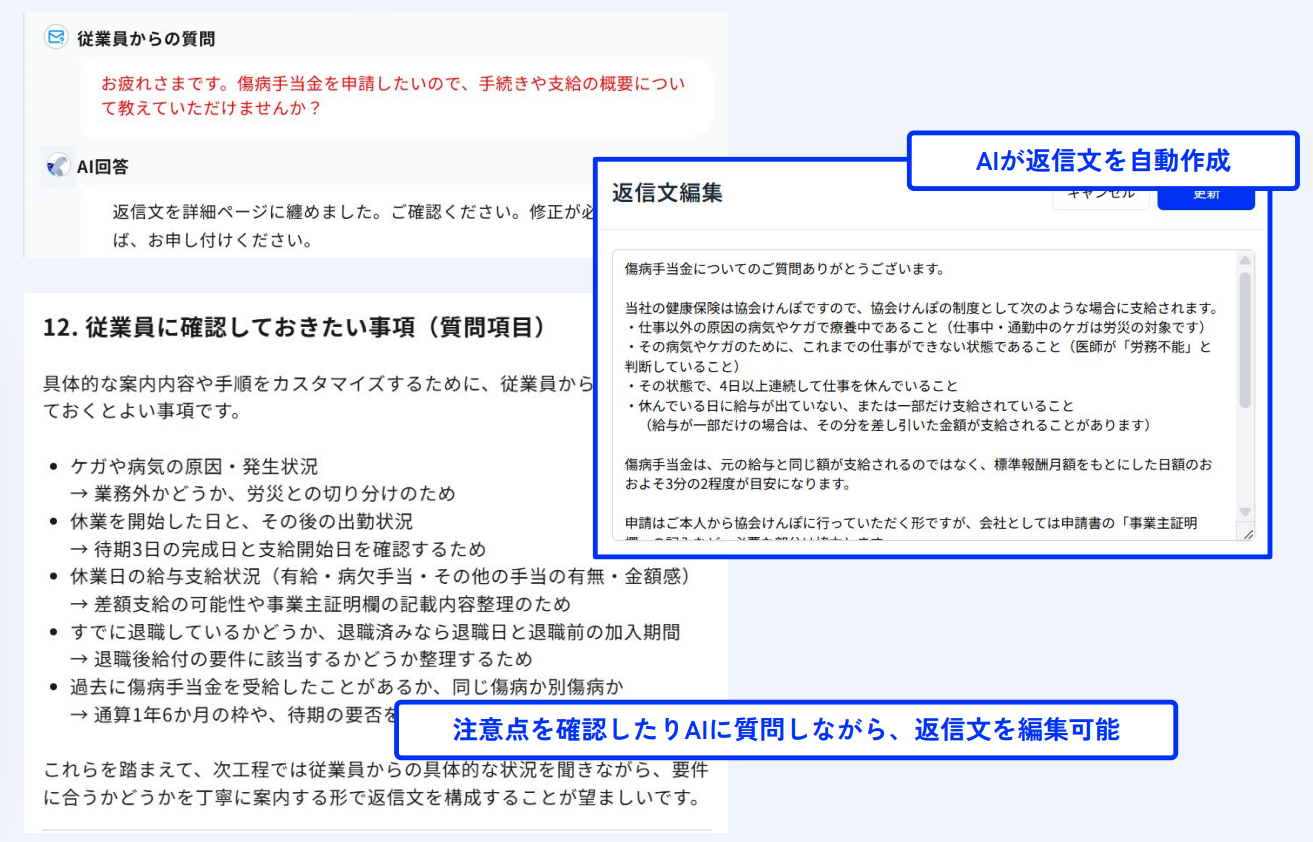 さらに、前提となる法令知識や実務上の注意点も合わせて提示するため、対応の効率化や品質向上だけでなく、トラブル予防、担当者の知識強化にも貢献します。