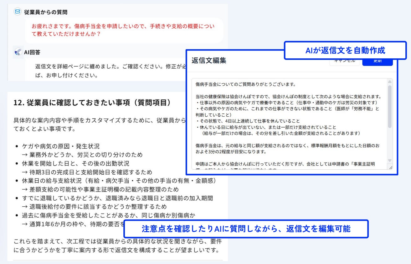 従業員からのメールをGmail経由でHRbaseに取り込むと、法令・就業規則・社内のマニュアルをもとにAIが返信文を自動作成。担当者は内容を確認して送信するだけで対応が完結します。