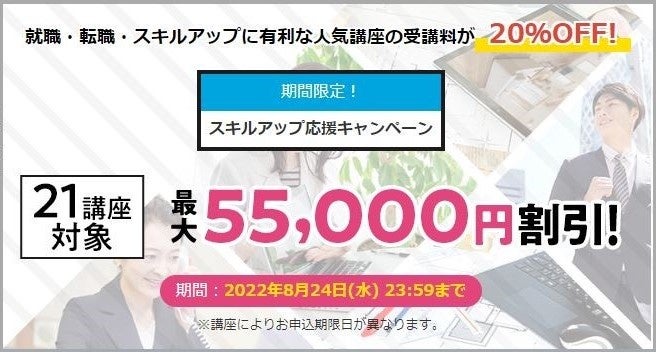 【期間限定!】就職・転職・スキルアップに有利な人気21講座の受講料が20%OFF!<8月24日(水)まで実施中>