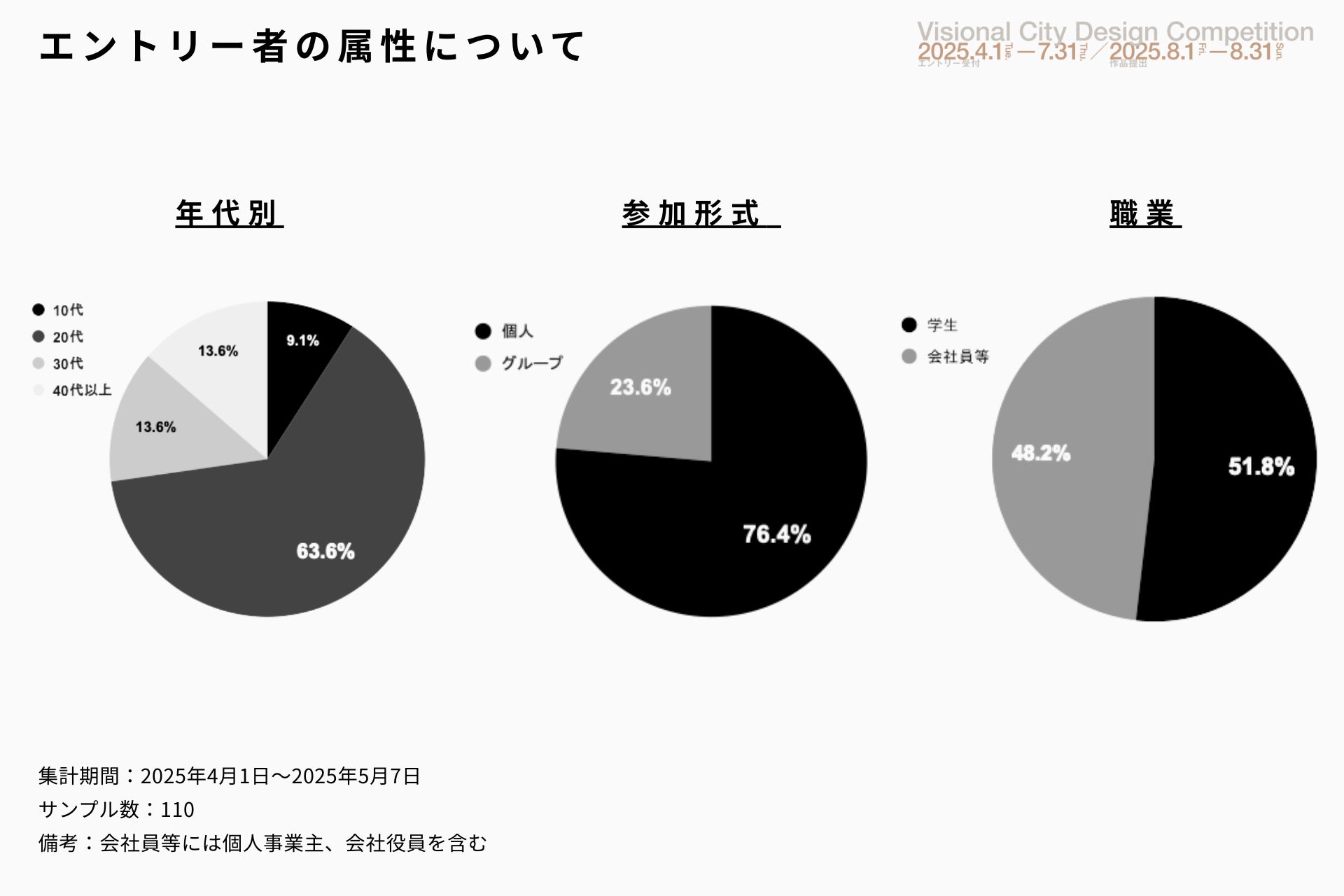 これまでのエントリー者は20代が多数を占め、個人参加が全体の約8割にのぼります。また、学生と会社員等の割合はほぼ同じとなっており、幅広い層からの関心をいただいています。