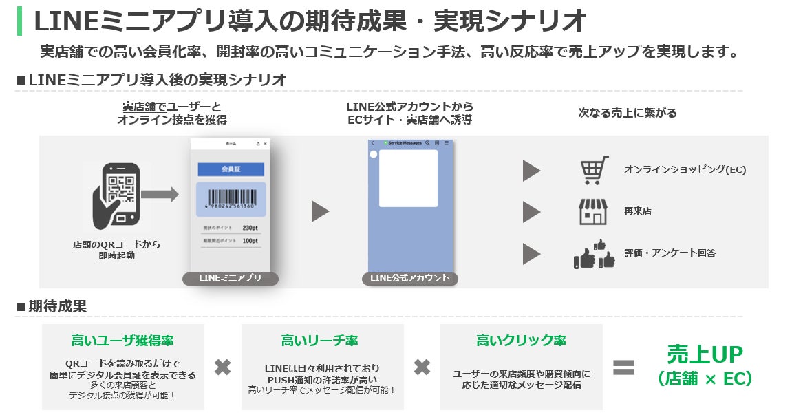 会員登録数の獲得においては、従来まで店舗スタッフがショップアプリのダウンロード方法や会員登録入力方法の説明などを5分から10分以上かけて会員登録手順のアシストを実施しており、お客様も作業の煩わしさから会員登録をお断りされる方も少なくありませんでした。しかし、LINEミニアプリではお客様が実店舗でお買い物をする際に、LINEアプリで店頭のQRコードを読み取るだけで「店舗・EC共通のデジタル会員証」を発行できるため、お客様はショップアプリをダウンロードし面倒な個人情報の登録を行うことなく、LINEアプリ上で簡単に会員登録を行い、LINEアプリ上でデジタル会員証をバーコード表示するだけでポイントをためることができるようになります。