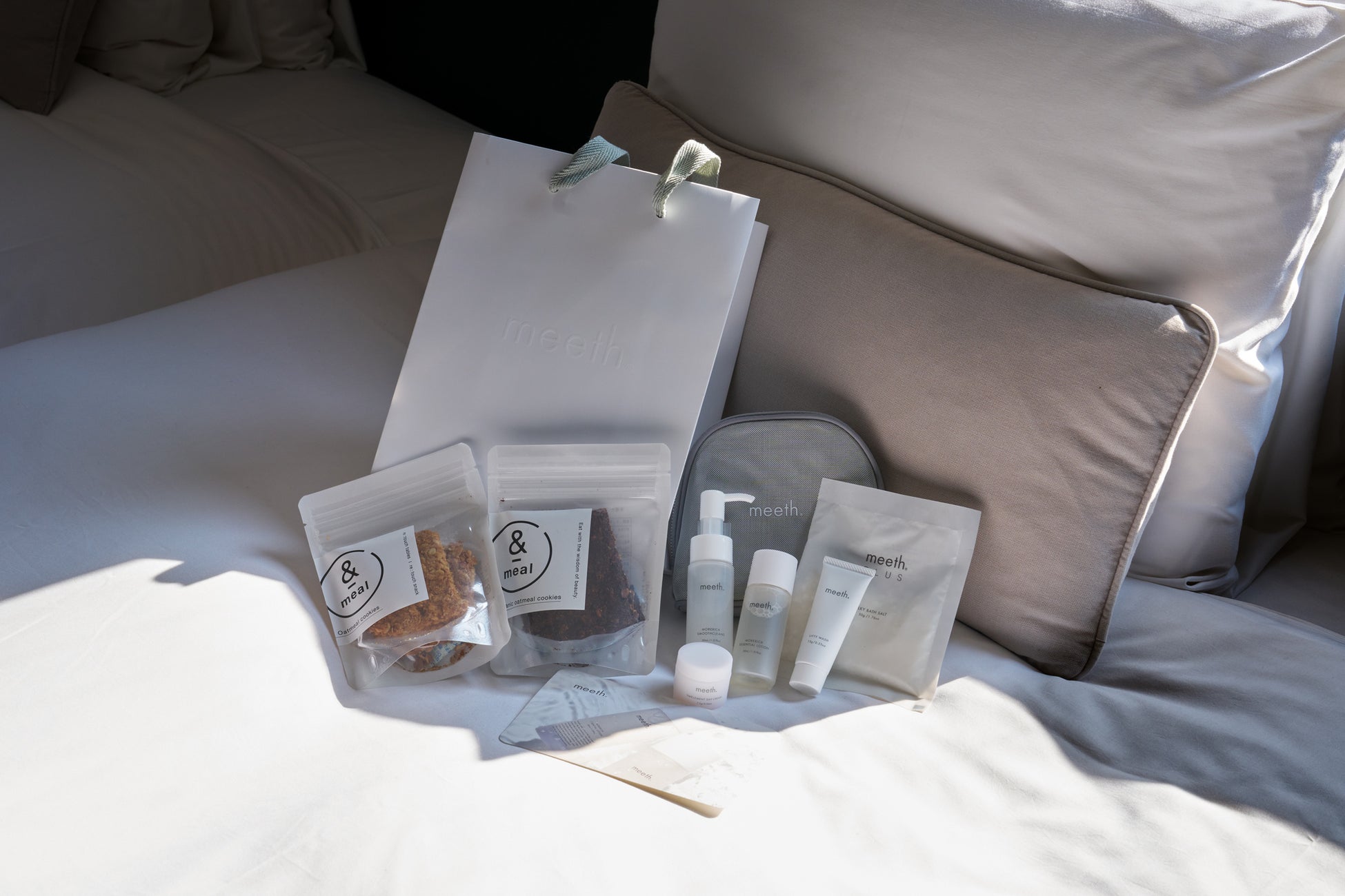 各ルームには、大人気のベーシックスキンケア3点が7日分入った『ミース スターターセット』や人気のバスソルト、&meal のオートミールクッキーをお持ち帰りギフトにご用意。その他のスキンケア、ボディケア、ヘアケアのアイテムなど、meeth のアイテムほぼ全てをアメニティとしてご用意。滞在中に meeth のあらゆるアイテムを使用でき、高品質で贅沢なケアを心ゆくまで体験できるプランを揃えます。