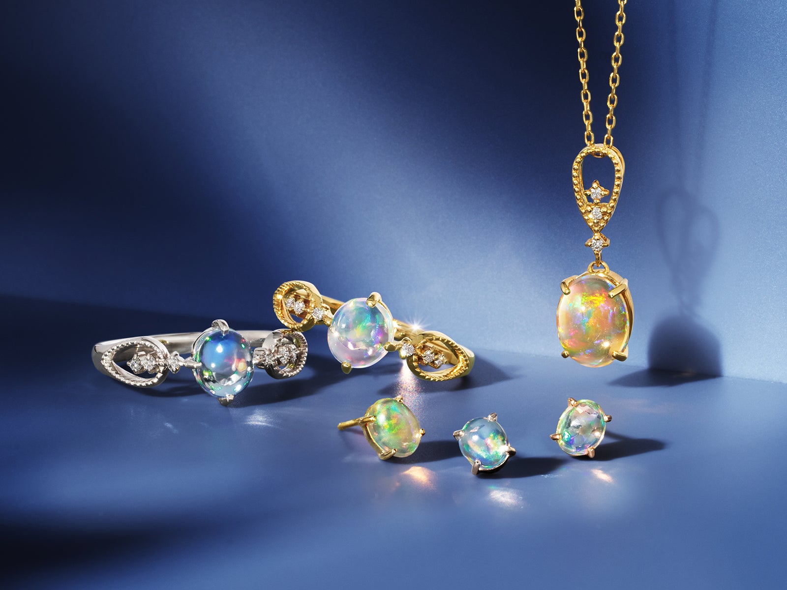 第一弾として、その日その瞬間ごとに姿を変える「オーロラ」をモチーフにしたコレクションを発表。オーロラの幻想的な色の揺らぎを、透明感と遊色を併せ持つ「メキシコオパール」を用いて表現したアイテムが並びます。