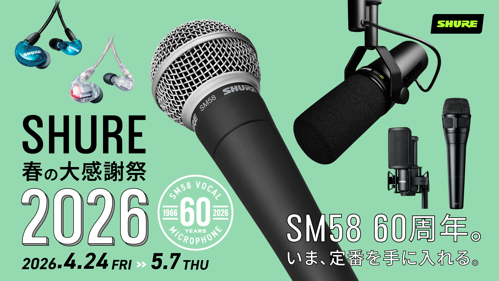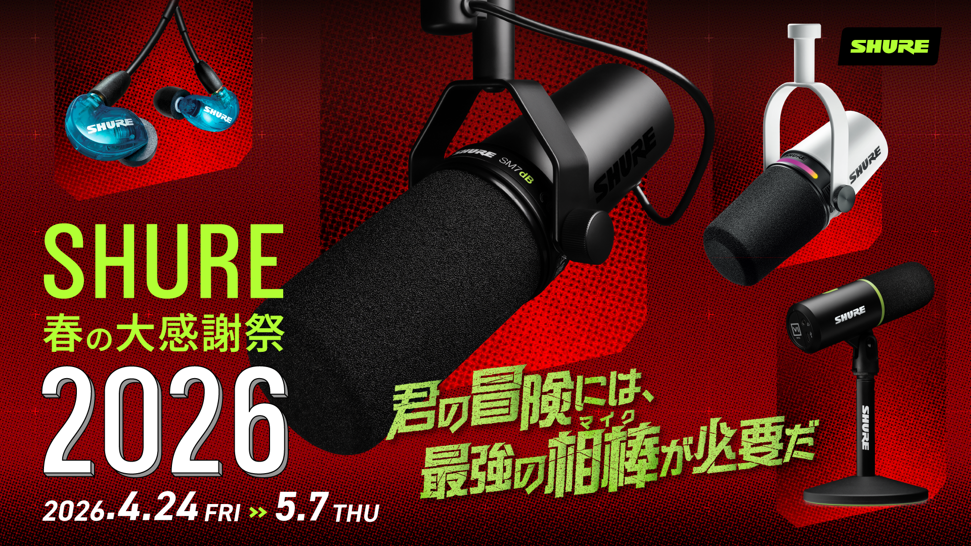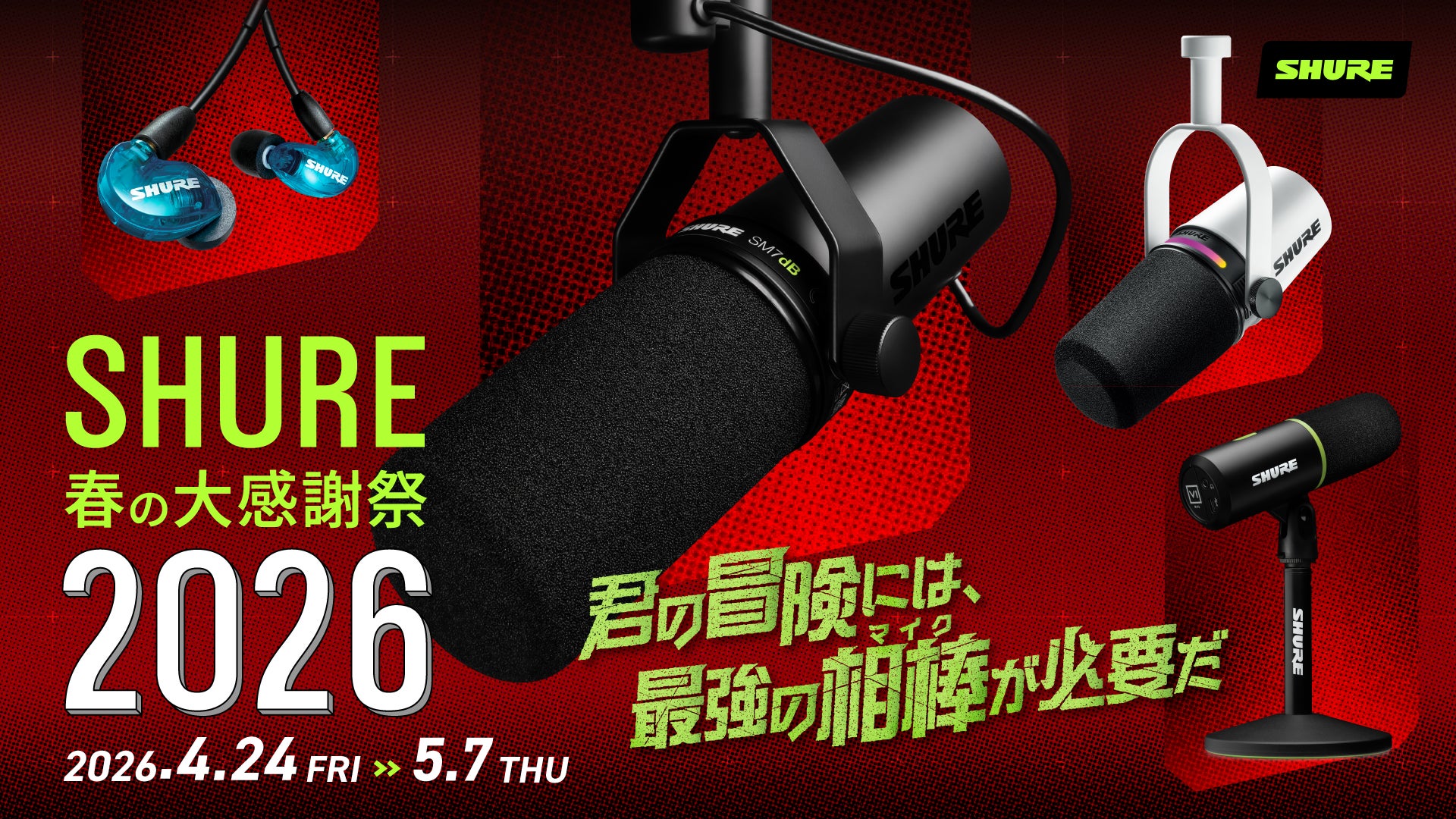 Shure(シュア)は、2026年4月24日(金)から5月7日(木)まで、全国規模のセールスプロモーション「SHURE 春の大感謝祭 2026」を開催いたします。この期間中は、全国のShure正規販売店およびオンラインストアで、Shureのマイクロホンならびにリスニング製品を特別価格でご提供いたします。