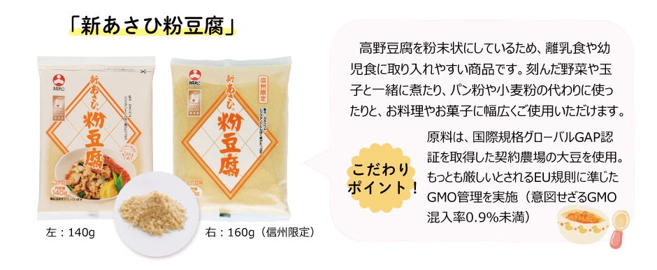 『新あさひ粉豆腐』は高野豆腐を粉末状にしたもので、離乳食や幼児食に取り入れやすいのが特長です。『新あさひ豆腐 うす切り』は“湯戻し不要” ”電子レンジ調理可能” といった時短調理に最適な点が特長です。今後もより身近に、より簡単にお使いいただけるよう、人の成長段階や生活スタイルに応じたさまざまな商品をお届けしてまいります。