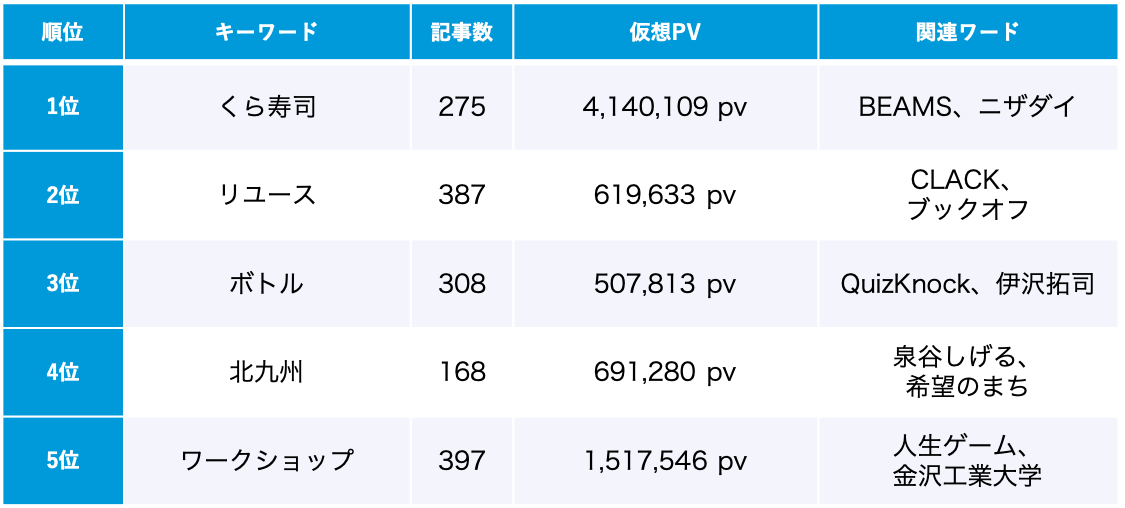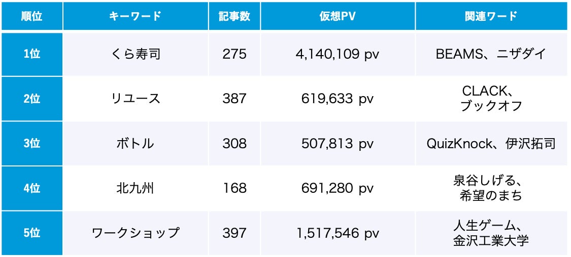 3位の「ボトル」はクイズ集団「QuizKnock」に関連した露出が強く出ています。イオンモールが行う「MYボトルデザインコンテスト」の授賞式でQuizKnockによる「SDGsクイズ大会」が行われたためで、そのプレスリリースが3つあったことで記事が集中しました。