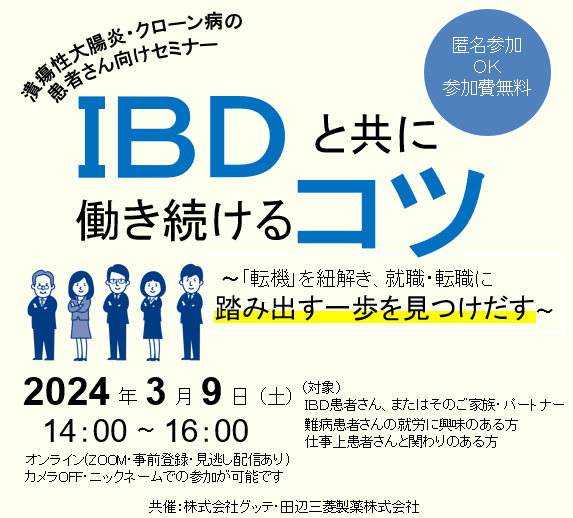 対象: IBD患者、IBD患者のご家族・パートナー、医療従事者、企業で勤務する支援者の方、難病就労に興味のある方
