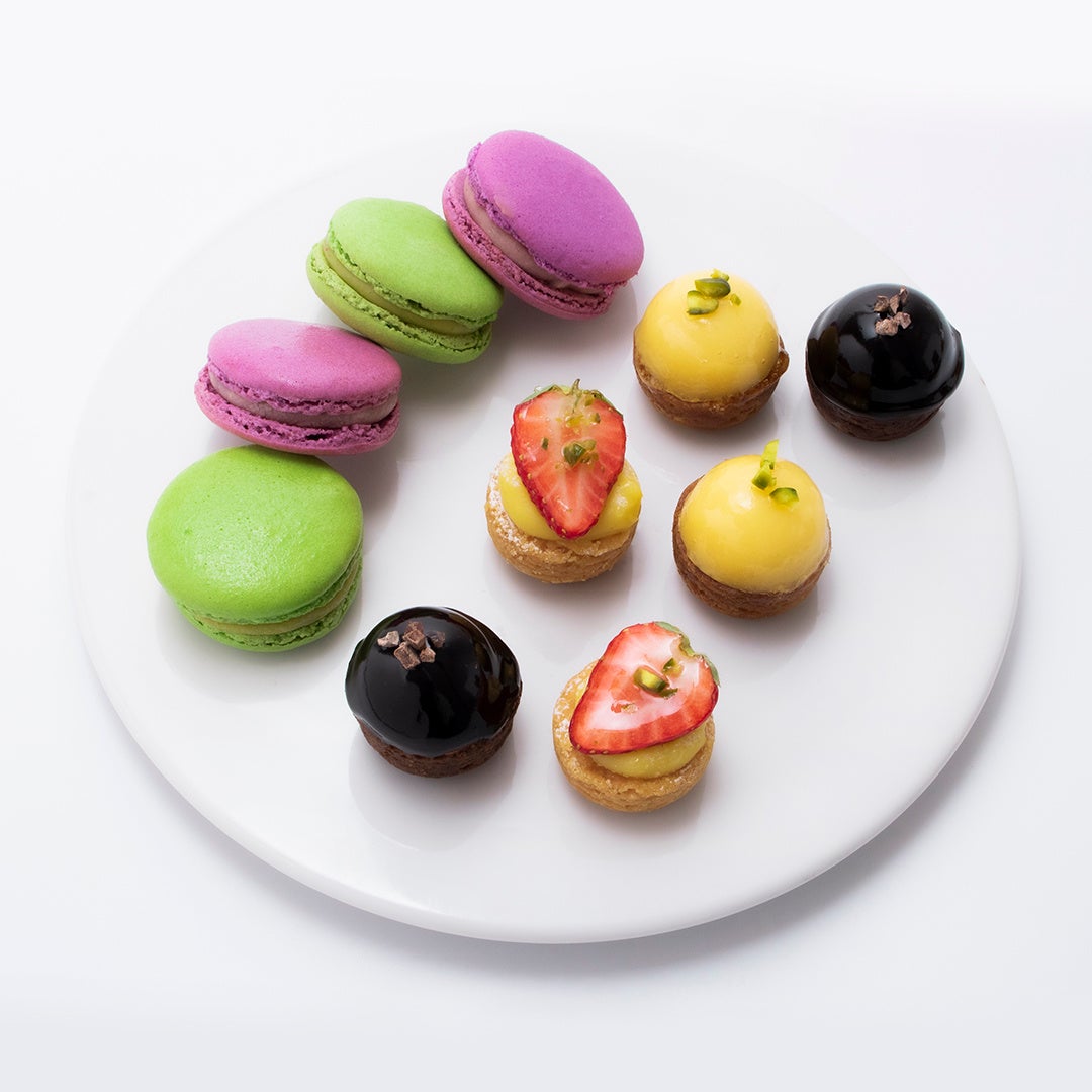 左からマカロン2種、プティフール3種