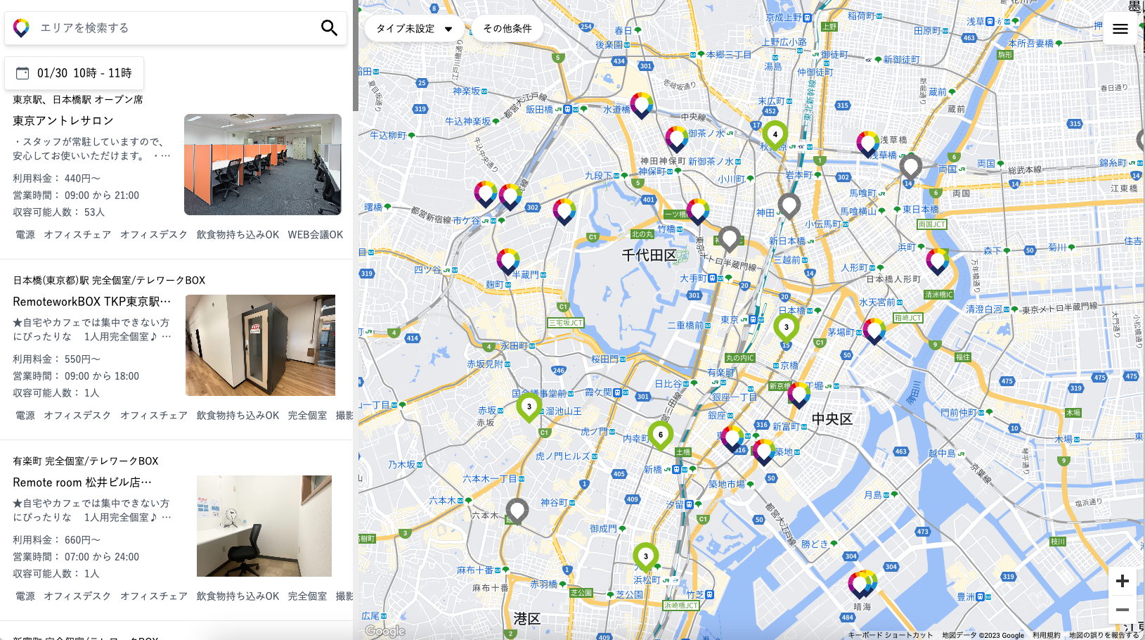 スペースの利用料金は各社別に設定されており、1時間数百円、1Day数千円が目安となります。