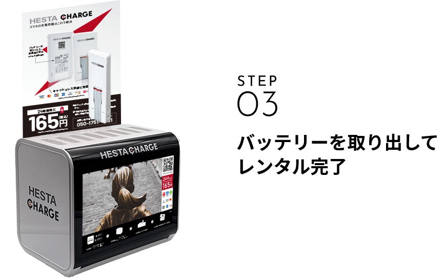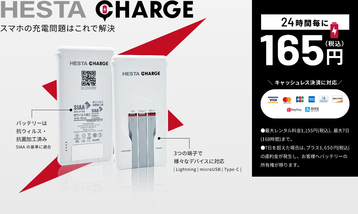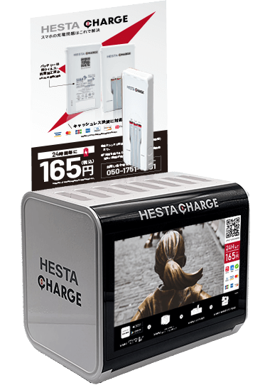 全国のお店・宿泊施設などに設置している「HESTA CHARGE」ステーションで、誰でも、いつでも、簡単に利用できることからモバイル機器にありがちな「電池残量少なくなってきたどうしよう・・・。」という悩みを一気に解決。設置メリットとしては、モバイルバッテリーの利用客を取り込むことで、幅広い客層の集客に期待できます。また、本体のデジタルサイネージを利用しての広告効果も期待されています。