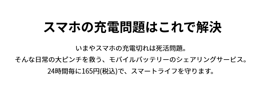 お店・施設などの空きスペースに設置した、充電済のモバイルバッテリーを安価にレンタルできるサービス。