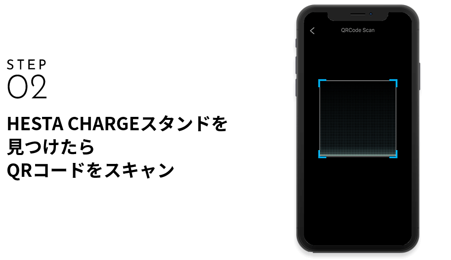 STEP2:「HESTA CHARGE」アプリでお近くの「HESTA CHARGE」を見つけたら、QRコードをスキャンし自動決済