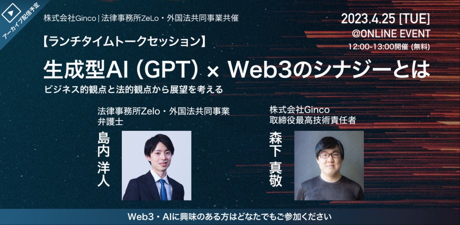AIやWeb3ビジネスを法務の面から支援する法律事務所ZeLoの弁護士と、Web3事業を展開する株式会社Gincoの取締役が、AIとWeb3の関連性や親和性のほか、双方の課題をどのように補い合うかなどについて、それぞれ意見交換を行う予定です。