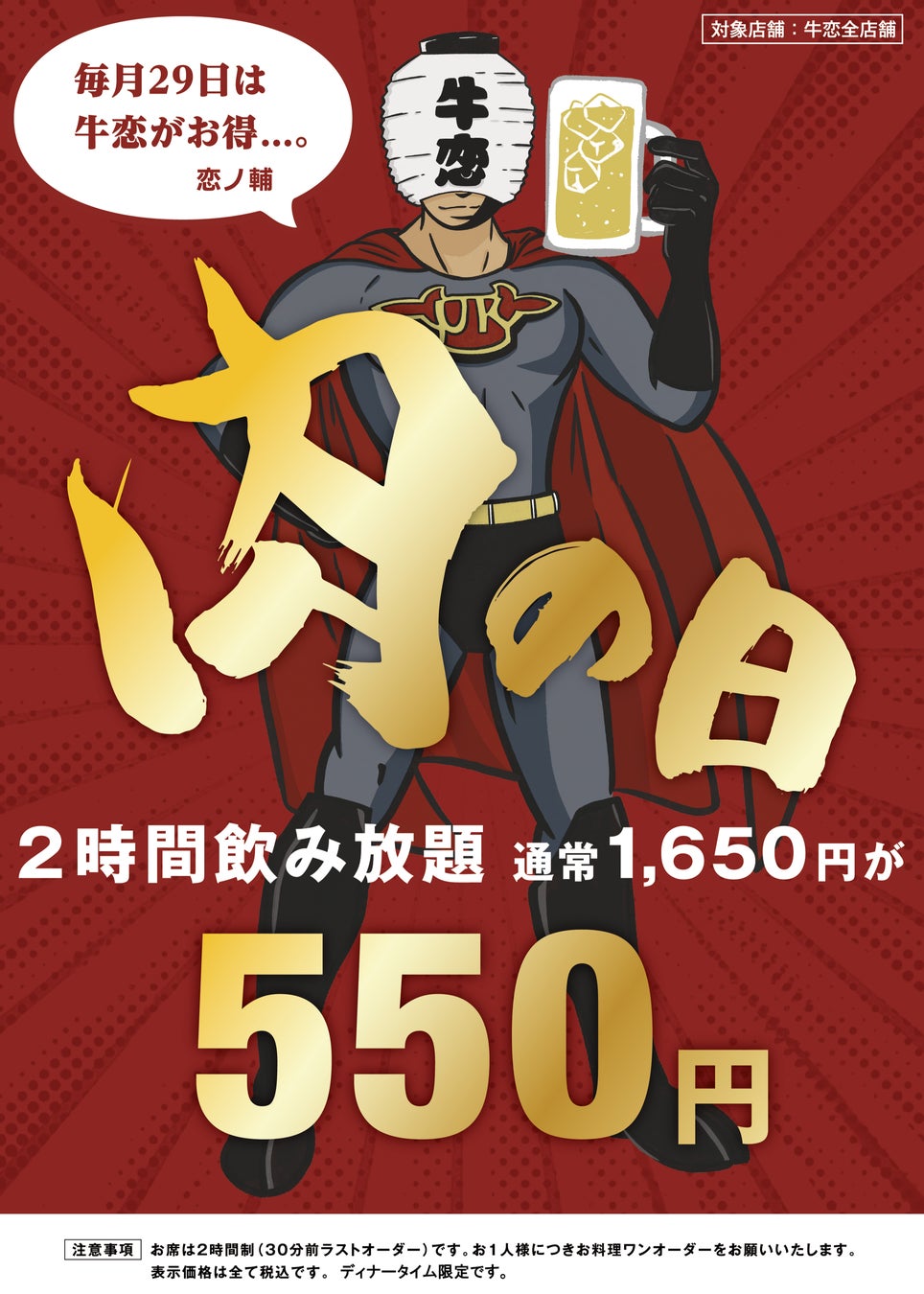 毎月29日“肉の日”限定。2時間飲み放題550円キャンペーン