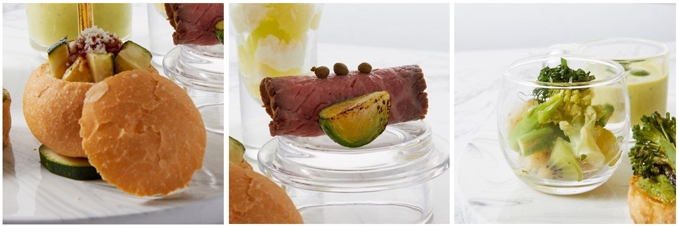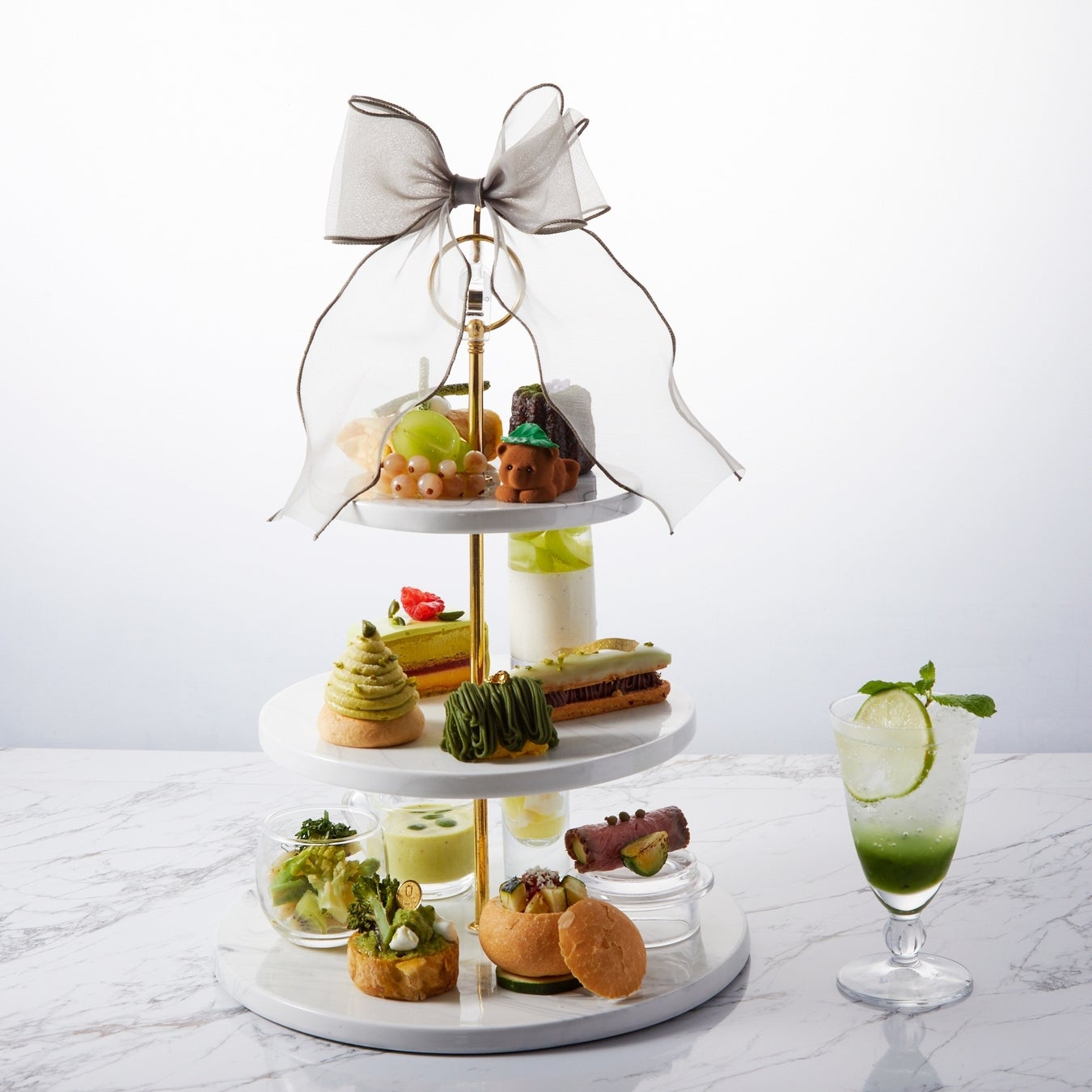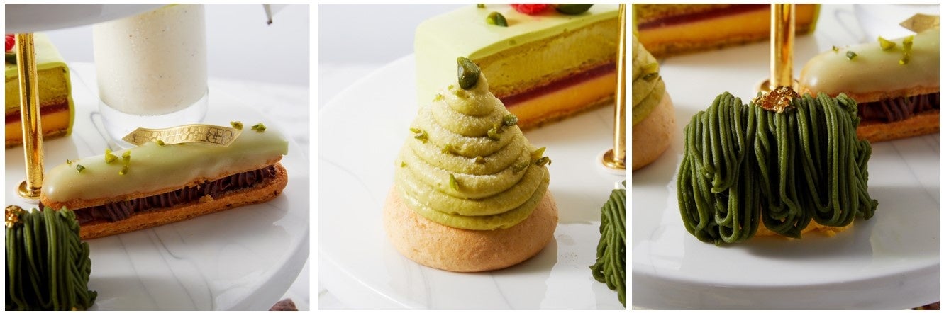 スイーツプレートでは、抹茶のカヌレや抹茶チーズケーキ、ガトーピスターシュやピスタチオクリームのモンブランなど、抹茶とピスタチオを使用したスイーツを中心に、グリーンカラーのバラエティ豊かなスイーツが並びます。また、A5黒毛和牛や帆立など、こだわりの食材を使用したセイボリーもセットされ、今秋しか味わえない贅沢な内容になっています。