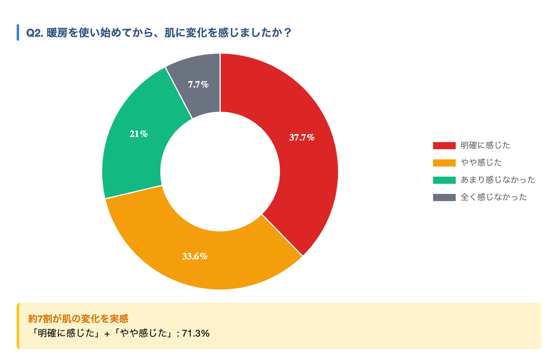 その結果、71.3%の方が「肌の変化を感じた」と回答し、約7割の人が暖房による室内環境の変化が肌に影響を与えていることを実感していることが明らかになりました。