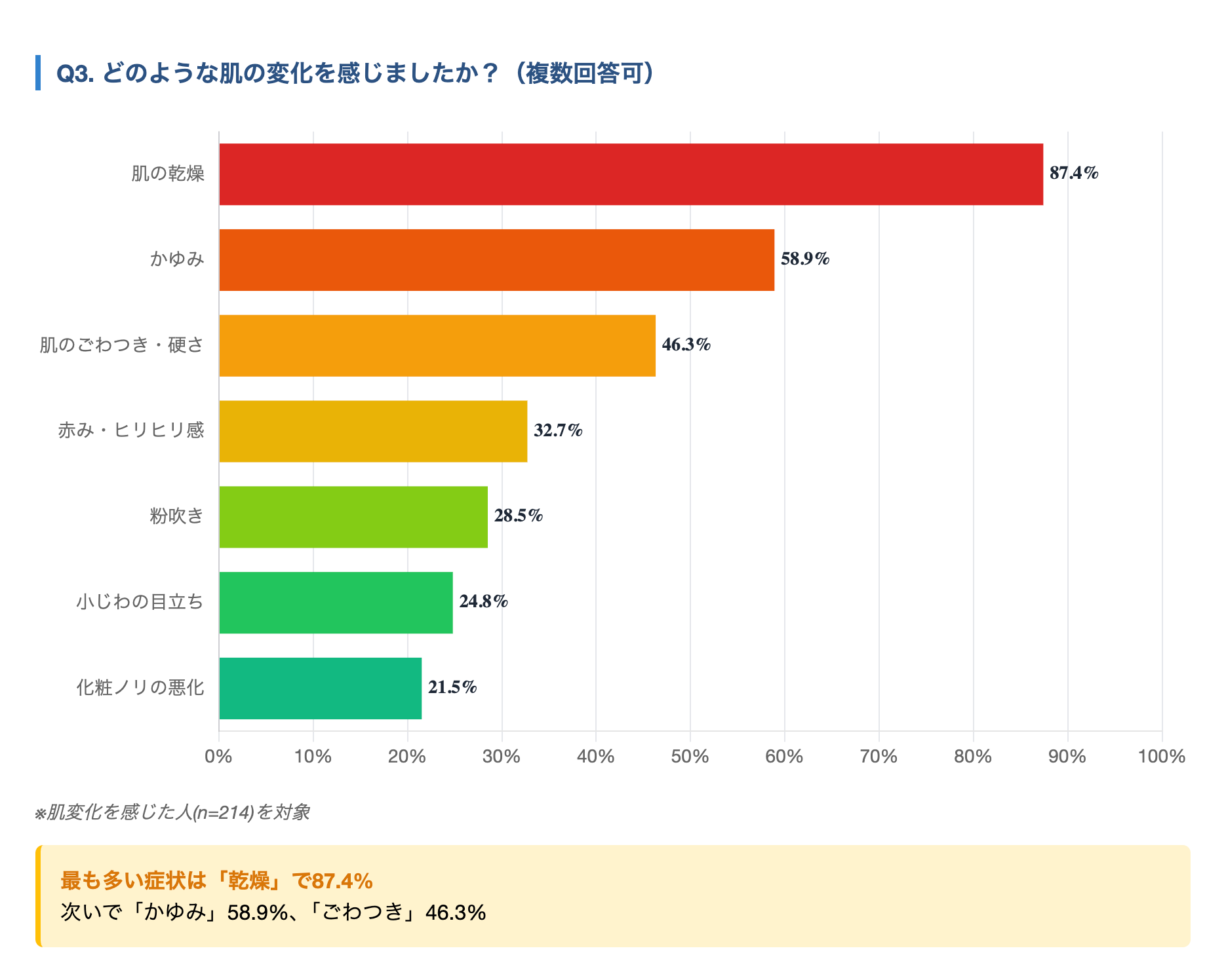 その結果、最も多かったのは「乾燥」で87.4%、次いで「かゆみ」(58.9%)、「肌のごわつき・硬さ」(46.3%)という結果になりました。