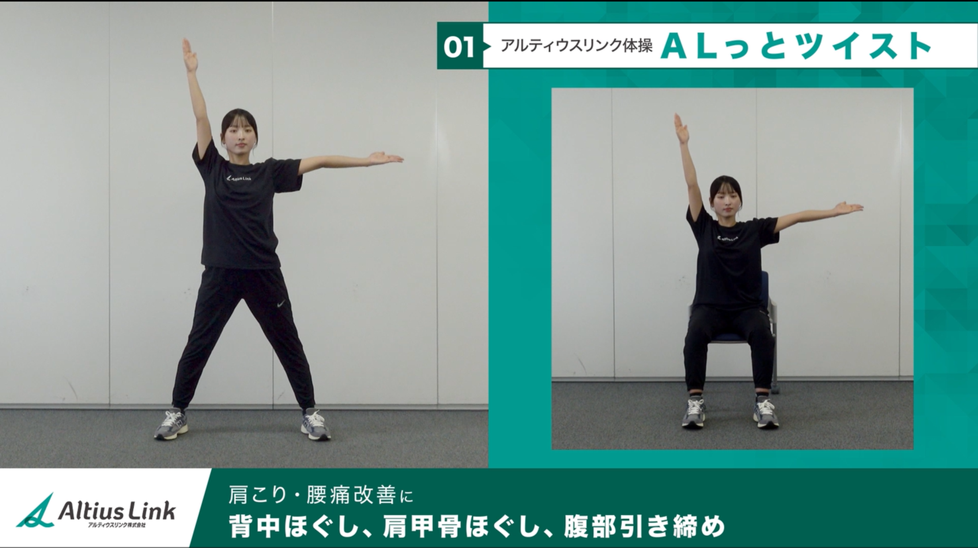 ・ALっとツイスト: 背中や肩甲骨をほぐし、腹部を引き締めることで、肩こり・腰痛を改善します。