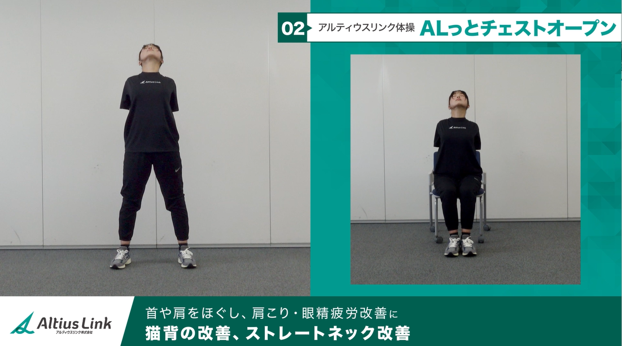・ALっとチェストオープン: 首や肩をほぐし、猫背の改善にも繋がる動きで、眼精疲労を和らげます。