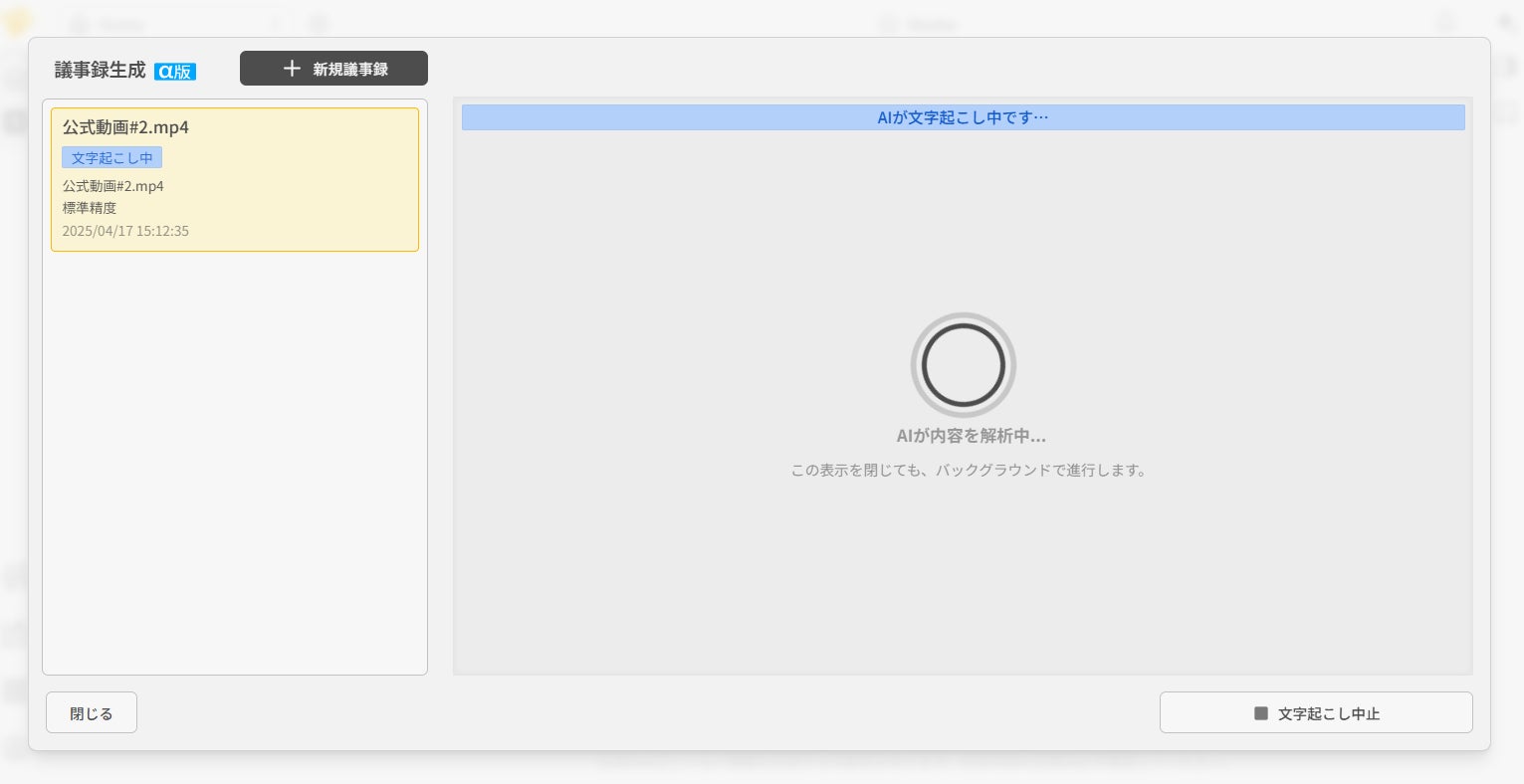 「議事録生成機能(α版)」が追加されました。この機能により、会議の音声や動画ファイルをテキストに変換することが可能になります。独自のフローとOpenAIの音声認識モデルを採用することで、高精度な文字起こしを実現します。結果として、会議後の議事録作成作業の効率が大幅に向上し、情報共有の質も高まります。