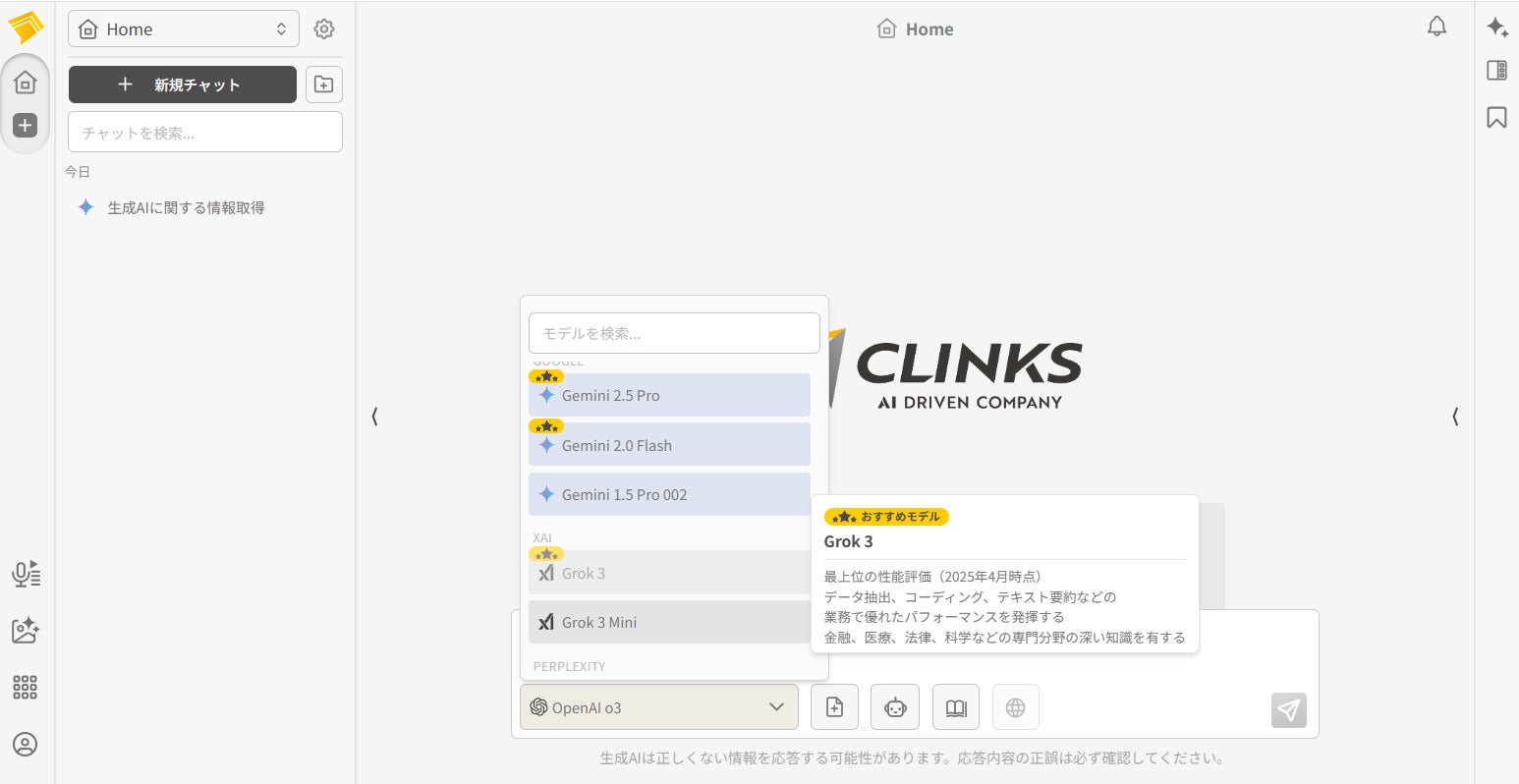AIサービスやシステム開発を手掛けるCLINKS株式会社(本社:東京都中央区、代表取締役:河原浩介)は、2025年4月17日(木)に法人向け生成AIチャットツール「ナレフルチャット」の機能を大幅に拡張しました。今回のアップデートでは、米OpenAIが4月16日(現地時間)に公開した最新AIモデル『o3』と『o4-mini』をいち早く導入したほか、『Grok3』『GPT4.1』『Gemini 2.5 Pro』など新たに7つの高性能AIモデルを追加しました。さらに動画や音声ファイルから自動で議事録を生成する新機能も実装し、企業の多様な業務ニーズに応えます。