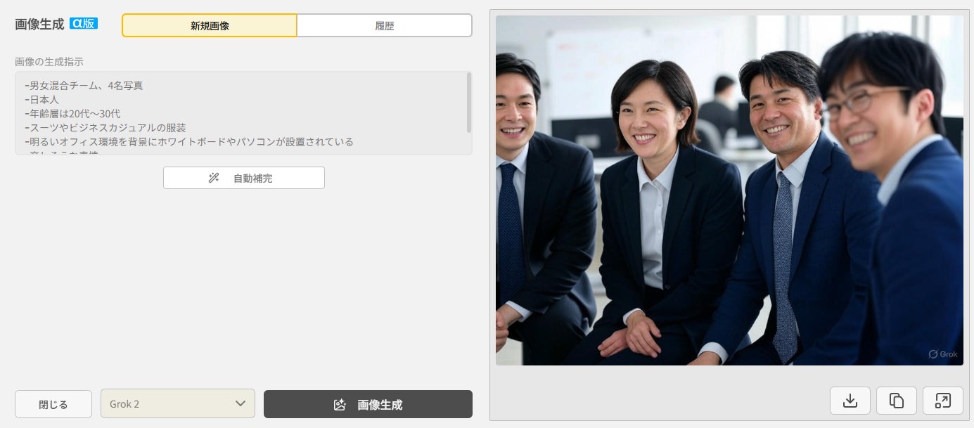 画像生成機能に新たなAIモデル「Grok 2」が追加されました。このモデルは、高速で質の高い写真のような画像を作成できる特徴があります。多言語に対応し、最新のデザイントレンドを反映した画像生成が可能です。