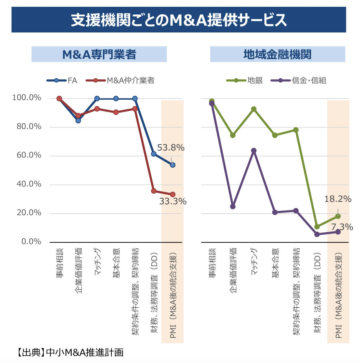 ただ、このPMIを支援している機関が少ないうえ、大企業のPMI事例はあるものの中小企業のPMI事例は非常に少ないことが実態です。