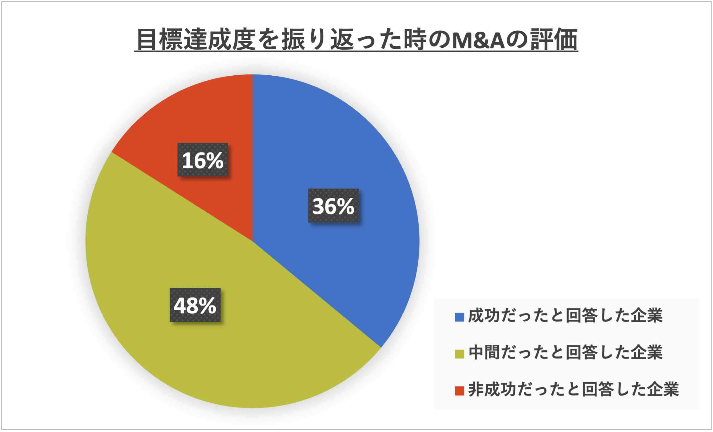 デロイトトーマツコンサルティングの「M&A経験企業にみるM&A実態調査(2013年)」では、調査年から数えて過去5年間にM&Aによる買収・売却を実施した企業のうち成功基準を達成していたと評価している企業は36%に留まっていることもわかっています。