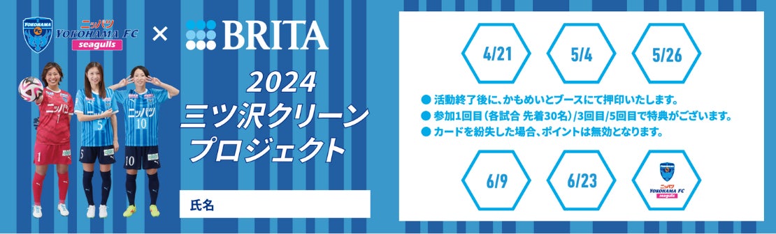 それに伴い、ブリタはチームサポートに留まらず、地域に根差した活動を行うニッパツ横浜FCシーガルズと共に、イベントを通して地域との交流を図り、環境保全活動への積極的な取り組みを呼びかけてまいります。2024年は、『2024三ツ沢クリーンプロジェクト』として、ホームゲームの試合後にニッパツ三ツ沢球技場にて計5回のクリーン活動を実施を予定しております。参加回数に応じた特典もご⽤意しておりますので、ぜひ試合終了後にお集まりください。