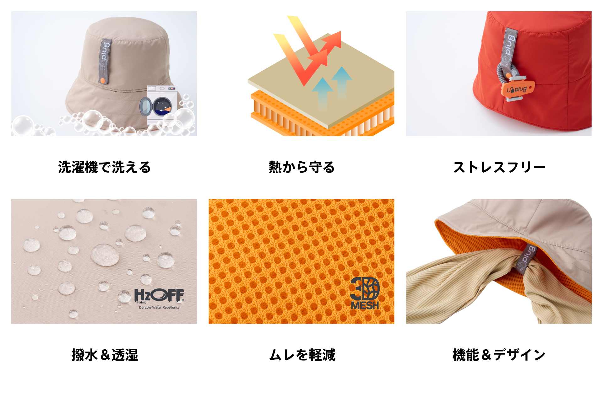 Unplugのサウナハットは、撥水・透湿性に優れる「H2OFF®︎」と、独自の3層構造「軽量3Dメッシュ」を採用。この組み合わせにより、頭の温度上昇を抑え、のぼせを防ぎます。