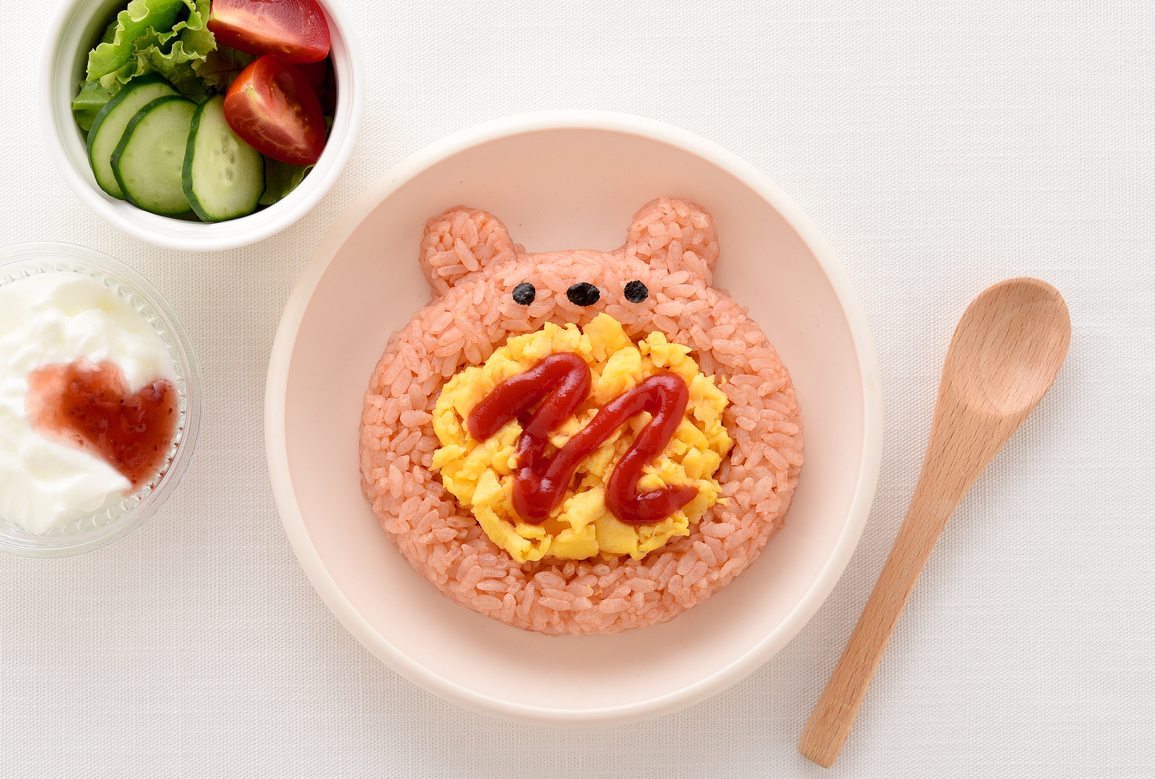 おかずを盛りつけるだけでいつものご飯がかわいく大変身します。白ご飯だけでなく、ご飯自体に麺つゆやケチャップなどで色付けするのもオススメです。また、海苔パーツを組み合わせれば、クマだけでなくパンダを作ることもできます。