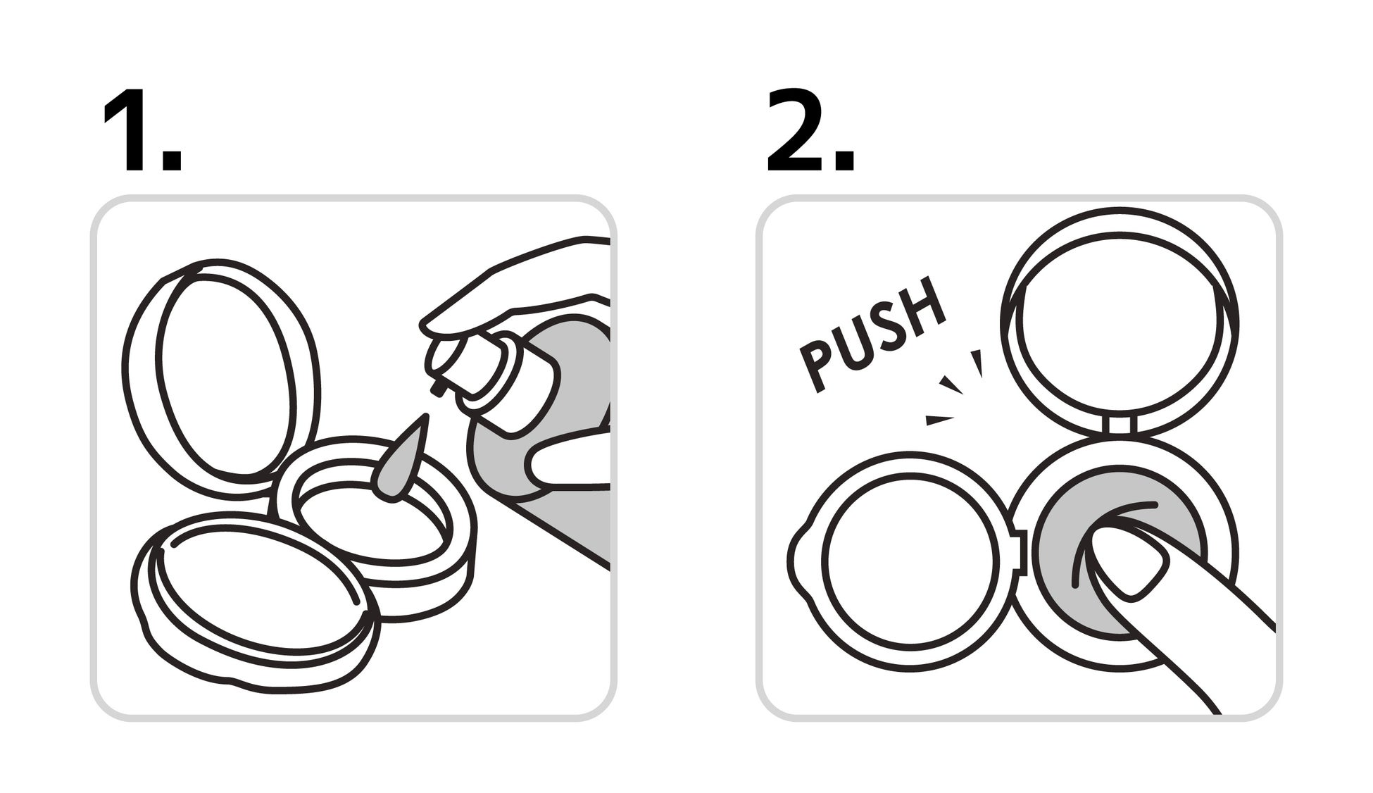 1.クッションキットを開け、スポンジをセットする前にケースの中にお好みのリキッドファンデーションを3~5回(約5g)押し出しながら注いでください。