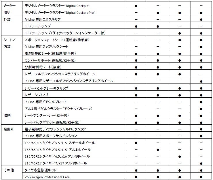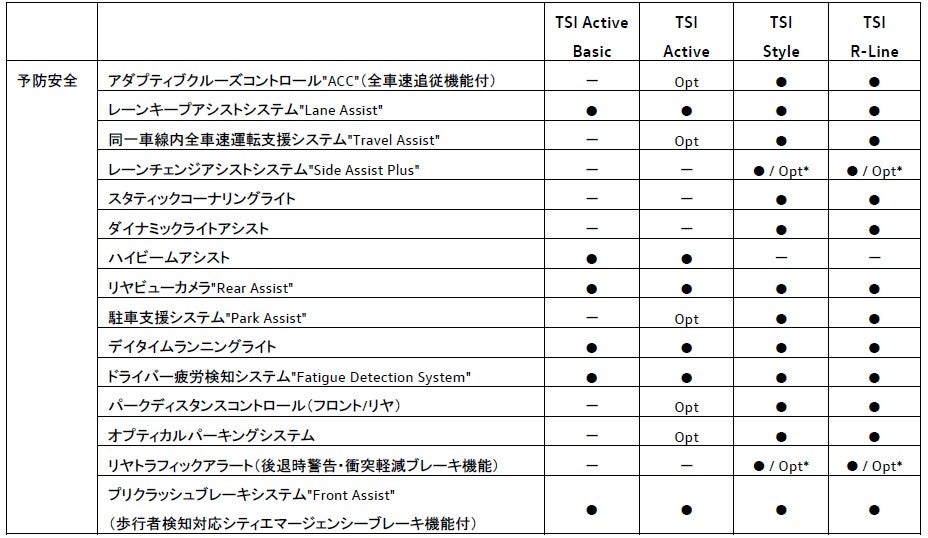 グレード展開は4グレード展開。従来のTrendlineに代わりLEDヘッドライトなどを標準装備する『Active Basic』、Comfortlineに代わりデジタルメータークラスター“Digital Cockpit Pro”などを標準装備する『Active』、Highlineに代わり同一車線内全車速運転支援システム“Travel Assist”やLEDマトリックスヘッドライト“IQ.LIGHT”を標準装備する『Style』を設定。また、スポーティな専用内外装を身に纏った『R-Line』も設定いたします。