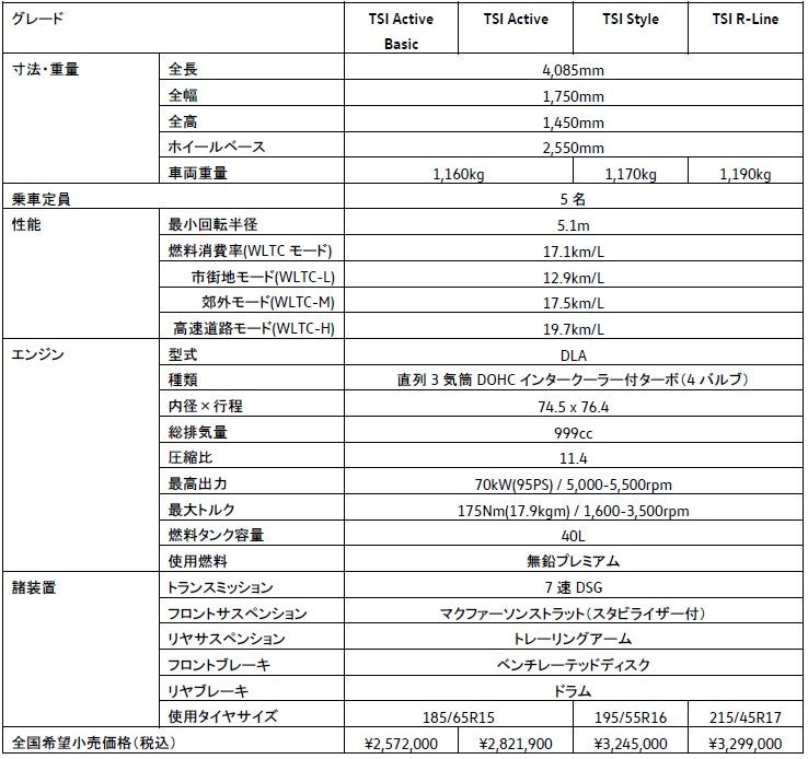 - TSI Active Basic 1.0L TSI(70kW) / 7速DSG ¥2,572,000